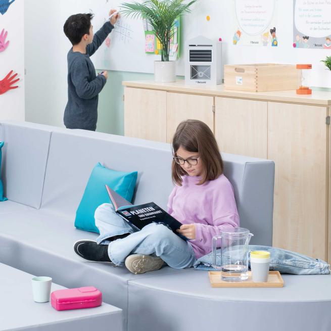 Die praktischen Baustein-Elemente der Clubbo-XXL-Serie passen Sie in bedarfsgerechten Kombinationen jeder Raumsituation an. So kreieren Sie auch auf kleinen Flächen bequeme Lese- und Sitzecken, z. B. in Pausen- und Gemeinschaftsräumen. Gestalten Sie beispielsweise durchgehende Sitzreihen aus Hocker- und Bank-Elementen oder Kombinationen mit dem Sofa. Mithilfe der platzsparenden Ecke auf quadratischer Grundfläche (73 x 73 cm) oder dem abgerundeten Viertelkreis-Hocker füllen Sie Raumecken. Die Hocker-Elemente eignen sich zugleich als Tische und lassen sich mit der Kuschelrolle ergänzen. Die jeweilige Sitzhöhe der gesamten Serie ist ideal für Kinder im Grundschulalter.