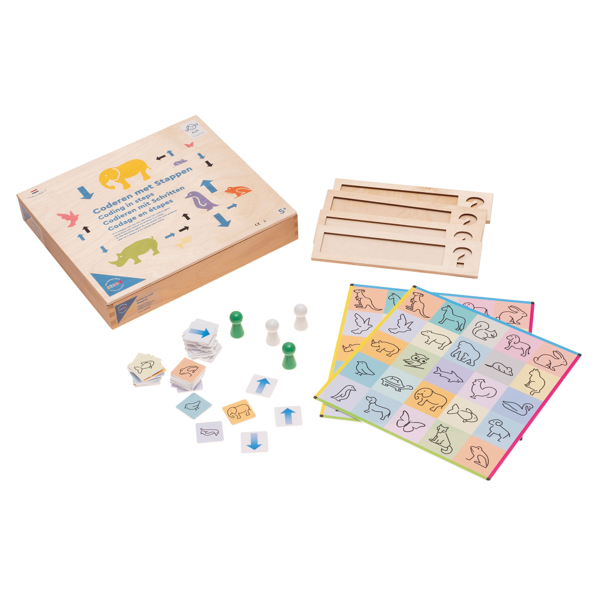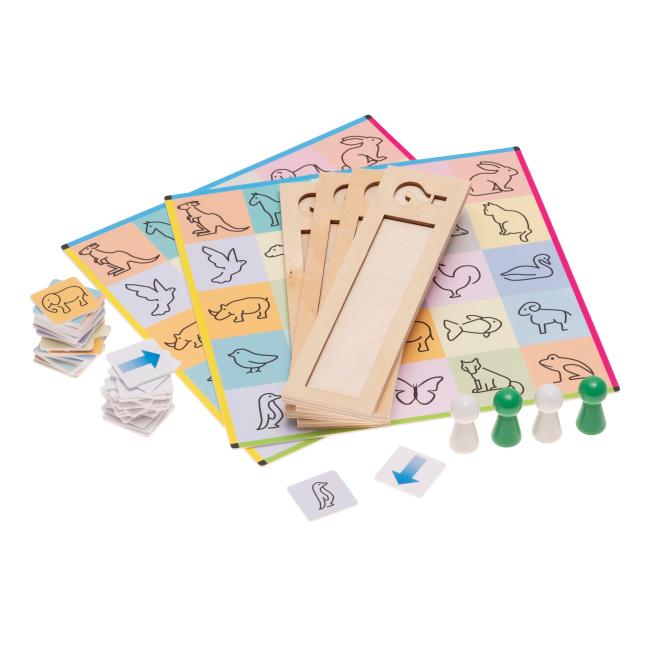 Jedes der 25 Felder auf den Spielbrettern zeigt den Umriss eines anderen Tieres. Ein Kind wählt eines der Tiere aus. Dann geht es 4 Schritte weiter zu einem anderen Tier. Dieses andere Tier ist nun das Ziel. Es gilt also, von einem gewählten Tier zu einem anderen zu gelangen. Das passende Tierkärtchen wird gezogen und verdeckt. Den Weg von Tier A zu Tier B codiert das Kind nun für die Mitspielenden anhand der Pfeilkarten. Haben die Mitspielenden diesen Code richtig entschlüsselt, sodass sie letztlich auf dem korrekten Tierfeld landen? Um dies zu prüfen, drehen sie die verdeckte Tierkarte um und gleichen die Pfeilcodierung ab.