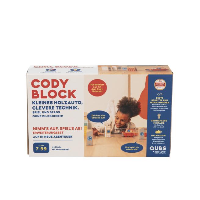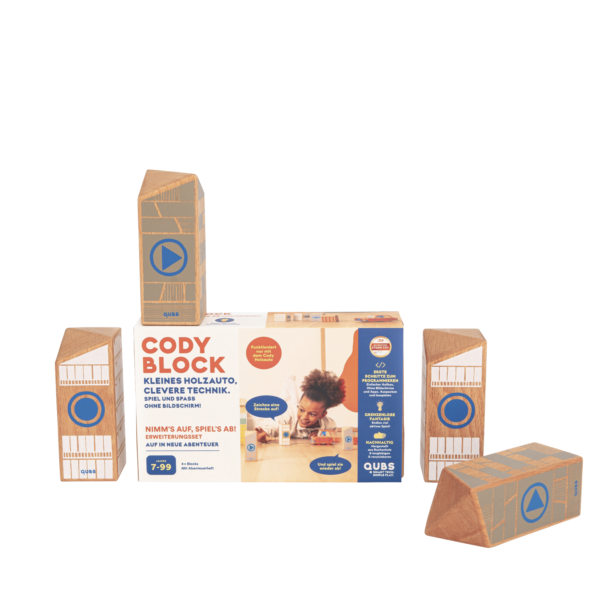 Von außen sind die Coding-Klötzchen wie klassisches Holzspielzeug gestaltet und zeigen je ein spezifisches Piktogramm für Aufnahme aufzeichnen oder Aufnahme abspielen. Im Inneren besitzen die Klötze RFID-Tags. Über diese sendet jeder Holzblock einen Aktionsbefehl an das Cody-Auto (nicht enthalten), sobald es nah genug an den Coding-Baustein herangefahren ist. Der Befehl entspricht dabei dem Piktogramm auf dem Baustein und Cody setzt die entsprechende Aktion direkt um. So erkennen die Kinder sofort, welche Auswirkung die einzelnen Holzblöcke auf das Fahrverhalten von Cody haben. Ein cleveres Lernprinzip, das klassisches und bildschirmfreies Spielen mit der Vermittlung eines grundlegenden Verständnisses fürs Programmieren verbindet.