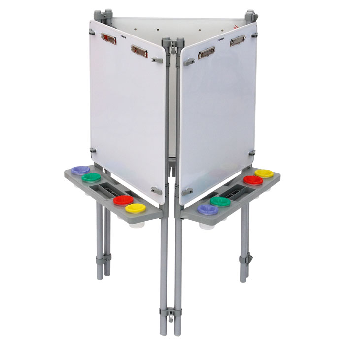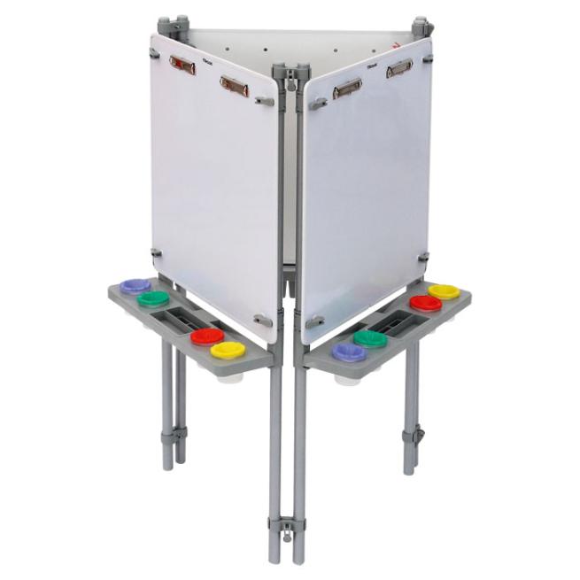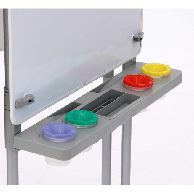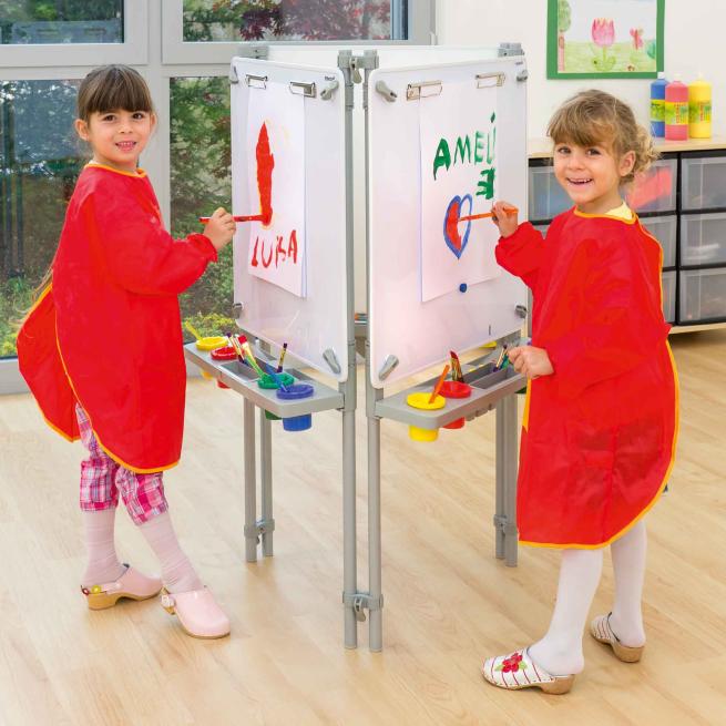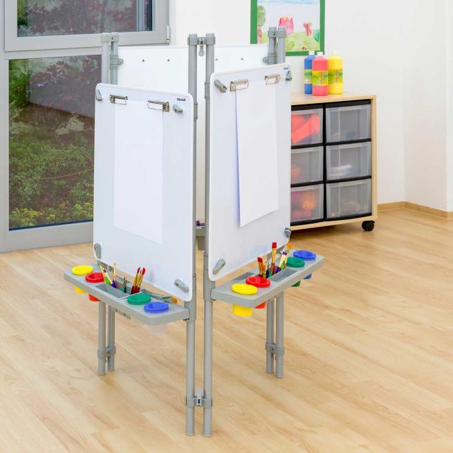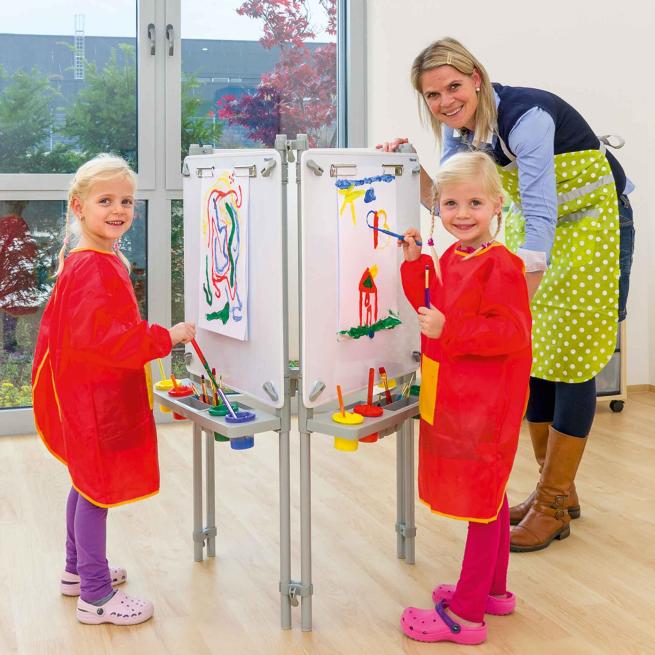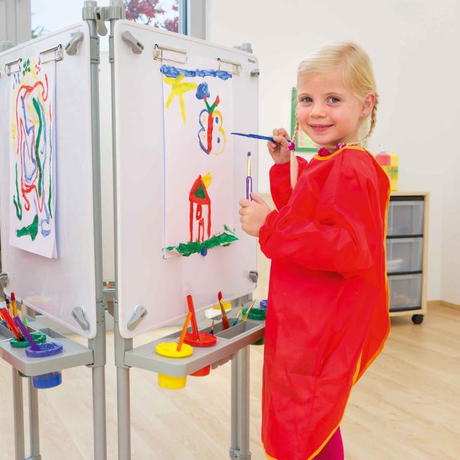 Die Kinder malen im Stehen – wie große Künstler. Professionell auch die Ablage für Pinsel und Farbbecher. Außerdem befinden sich an jeder Malfläche 2 Klammern zum Befestigen des Papiers. Die Malwände sind magnethaftend, abwischbar, höhenverstellbar und beliebig erweiterbar. Mit Aufbauanleitung.