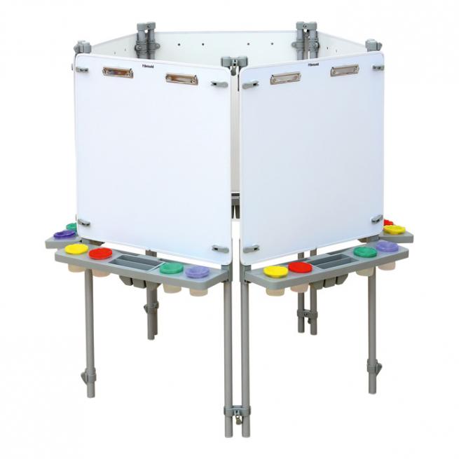 Die Kinder malen im Stehen – wie große Künstler. Professionell auch die Ablage für Pinsel und Farbbecher. Außerdem befinden sich an jeder Malfläche 2 Klammern zum Befestigen des Papiers. Die Malwände sind magnethaftend, abwischbar, höhenverstellbar und beliebig erweiterbar. Mit Aufbauanleitung.