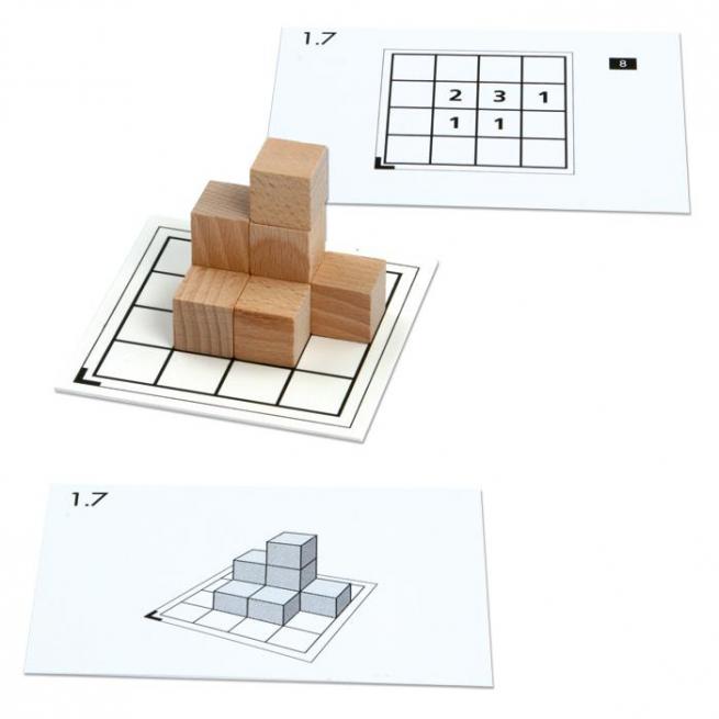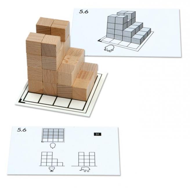 Die Aufgabenkarten von Set 2-5 zeigen 3 Ansichten (Vorder-, Seitenansicht und Draufsicht) eines Bauauftrages. Die Aufgabenkarten von Set 1 sind einfacher und zeigen nur einen Bauplan. Mit Würfeln bauen die Schüler auf einer Rastertafel den gestellten Auftrag nach. Zur Selbstkontrolle befindet sich auf der Rückseite der Aufgabenkarte die Lösung in 3-dimensionaler Darstellung.