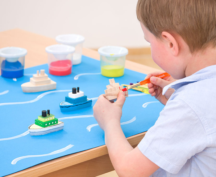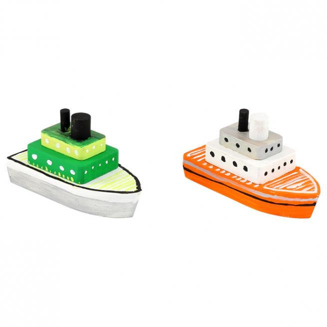 Also ran an den Schiffsbau und die kreativen Ideen. Ihre Kinder stecken die fünf einzelnen Holz-Schiffsteile einfach zusammen und Sie helfen mit ein wenig Holzleim nach. Jetzt kommen Farben und Pinsel zum Einsatz und wenn die Dampfer fertig sind, heißt es „Ahoi“, wenn die Kinder sie z. B. auf blauem Tonkarton mit eigens gemalten Wellen zu „Wasser“ lassen.