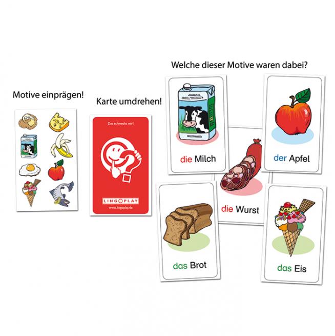 Nun sehen sie sich ihre eigenen Bildkarten mit Einzelmotiven an und vergleichen diese Einzelmotive mit denen, die sie anfangs auf der offenen liegenden Karte gesehen haben. War dieses Einzelmotiv auch auf der Objektkarte abgebildet? Dann muss dieses Motiv mit seinem Artikel benannt und die entsprechende Bildkarte abgelegt werden.