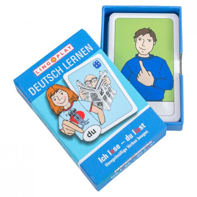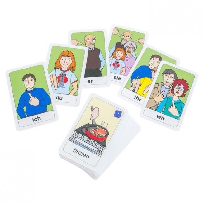Unregelmäßige bzw. starke Verben verändern beim Deklinieren ihren Stammvokal. Beispiele wie „ich helfe, du hilfst“ oder „ich gebe, du gibst“ sind nicht leicht zu lernen. Dabei ist das Kartenspiel ein sehr guter Helfer. Beim Nennen, Lesen und Deklinieren der speichern die Schüler die unregelmäßigen Verben spielend ab.