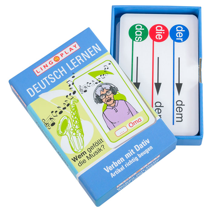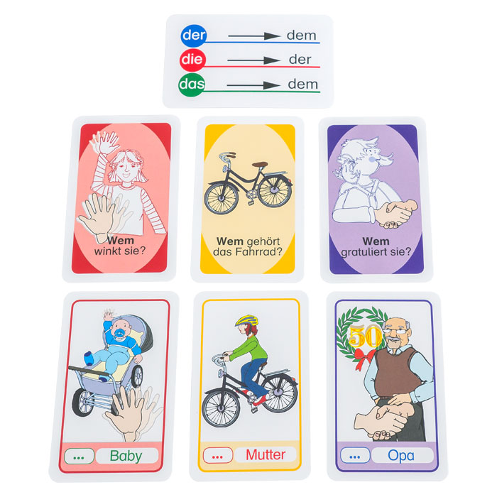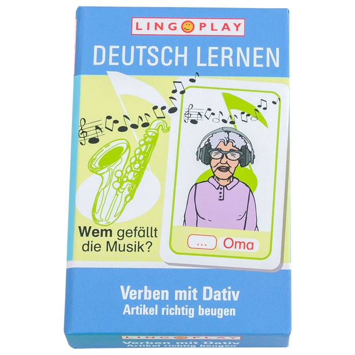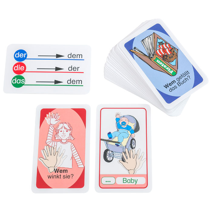 Wenn Verben ein Dativobjekt verlangen, muss auch der Artikel dazu richtig gebeugt werden. Mit dem Kartenspiel lernen Ihre SuS dies spielend. Dazu ordnen sie Fragekarten entsprechenden Antwortkarten zu, wobei sie die Nomen mit den Artikeln der, die und das richtig beugen. Beispiel: Wem gefällt die Musik? Der Oma.