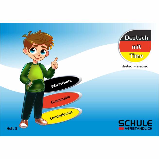 »Deutsch mit Timo« ist eine Lernreihe aus zweisprachigen Arbeitsheften mit Lernvideos. Dieses Konzept hilft Kindern anschaulich sowie nachvollziehbar beim Erlernen der für sie neuen Sprache Deutsch und bietet ihnen trotz unterschiedlicher Herkunft gleiche Startchancen. Erhältlich ist die Lernreihe in den Muttersprachen Arabisch, Russisch, Türkisch und Ukrainisch mit jeweils 5 Heften und 150 Videos. Die Hefte bauen aufeinander auf und steigern sich im Schwierigkeitsgrad.