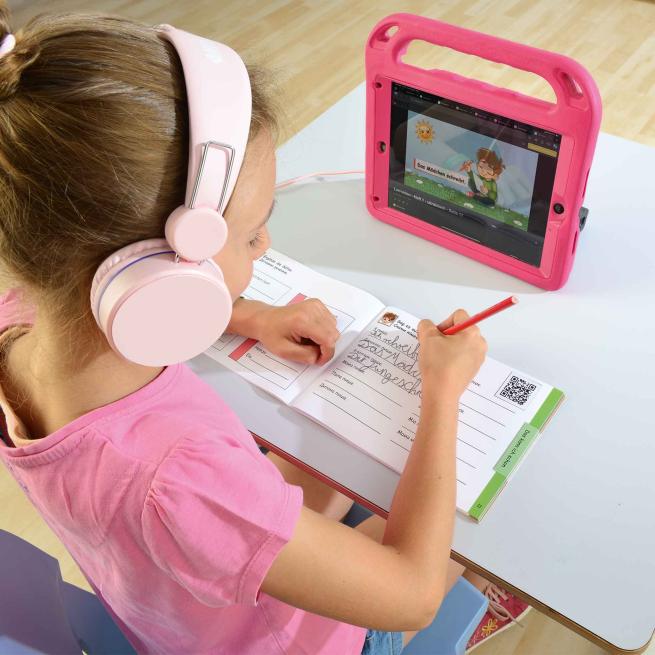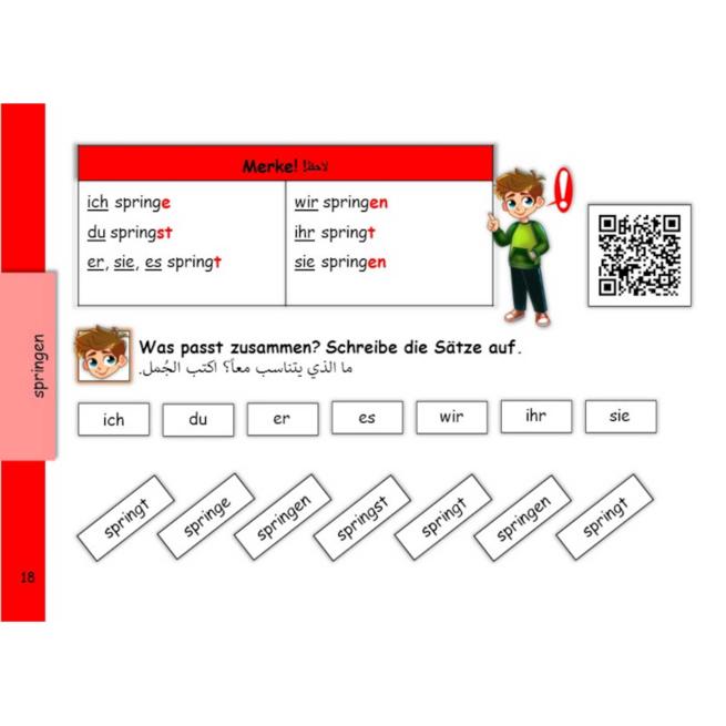 Öffnen Sie das Lernvideo über den QR-Code. Das Kind schaut sich das Video zunächst an. Je nach Seite im Heft wird entweder der neue Wortschatz eingeführt oder die Grammatik in der Muttersprache erklärt. So versteht das Kind direkt, was es tun soll und trainiert die neuen Vokabeln oder die neuen grammatischen Strukturen. Die Lösung kontrolliert das Kind nicht nur lesend, sondern auch hörend. Dadurch verbessert sich gleichzeitig die Aussprache der neu zu lernenden Sprache Deutsch enorm. Die kleinen Hinweise und Hilfestellungen in der Muttersprache geben dem Kind Sicherheit. Zudem fühlt es sich am Ende jeder Lerneinheit durch Applaus und eine digitale Krone motiviert, weiterzumachen. In seiner Muttersprache kommt das Kind zum Schluss in seiner Muttersprache erklärt, welche Aufgaben es in seinem Arbeitsheft machen kann, um das Gelernte effektiv und mit Spaß zu trainieren.