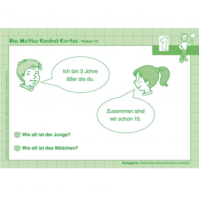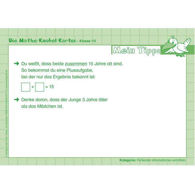 Fantasievolle und lebensnahe Knobelaufgaben aus der Erfahrungswelt der Kinder fordern die mathematischen Fähigkeiten Ihrer Schüler heraus. Die Kinder entdecken, wie sich auch Alltagssituationen in der Sprache der Mathematik ausdrücken lassen. Dabei wird angeregt kombiniert, gerechnet und verglichen. Die robusten Karten sind in 3 Schwierigkeitsstufen sortiert. Für alle Aufgaben gilt: erst denken, dann rechnen. Auf den Kartenrückseiten finden sich Tipps, die selbstständige Lösungen erleichtern. Ideal für Kleingruppenarbeit, Mathekonferenzen und Freiarbeit.