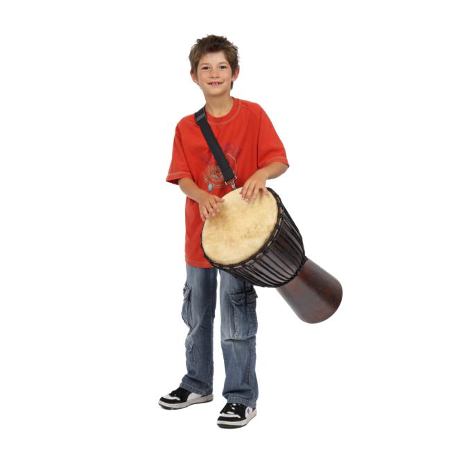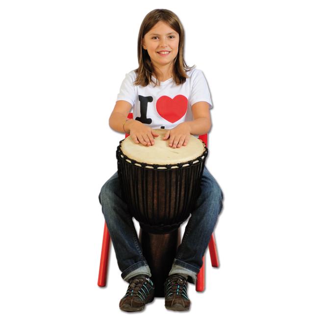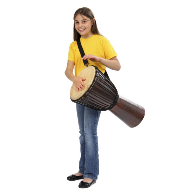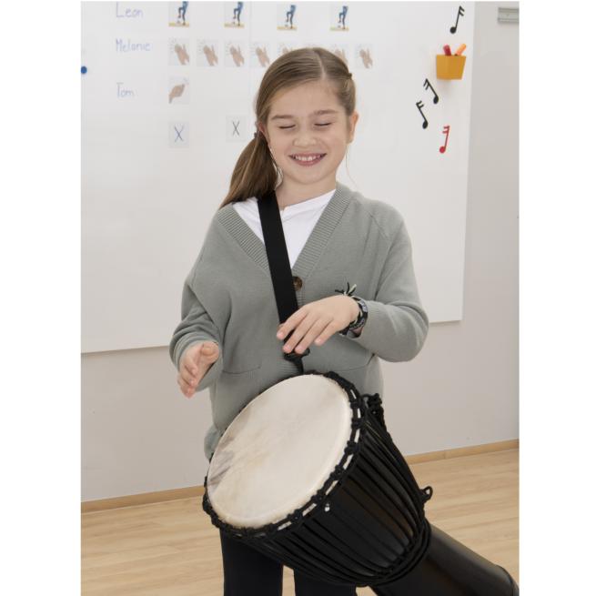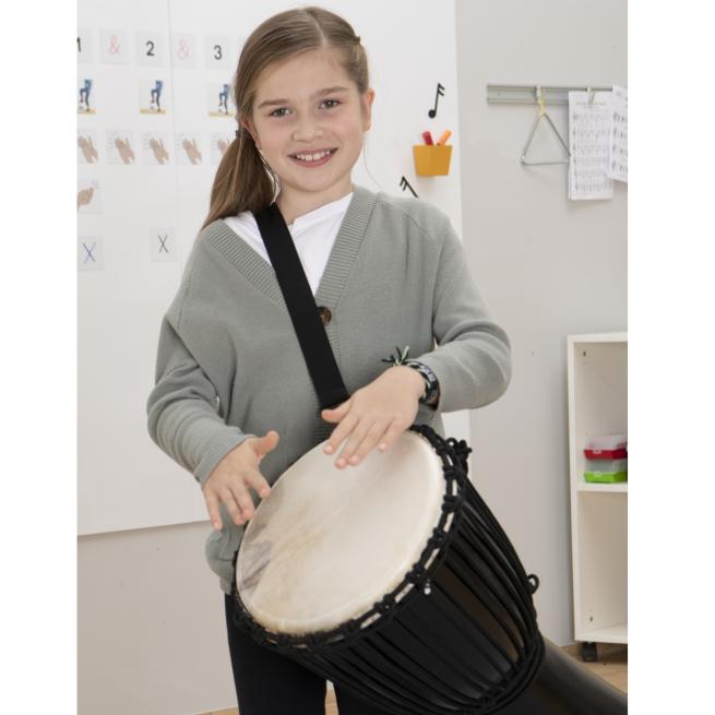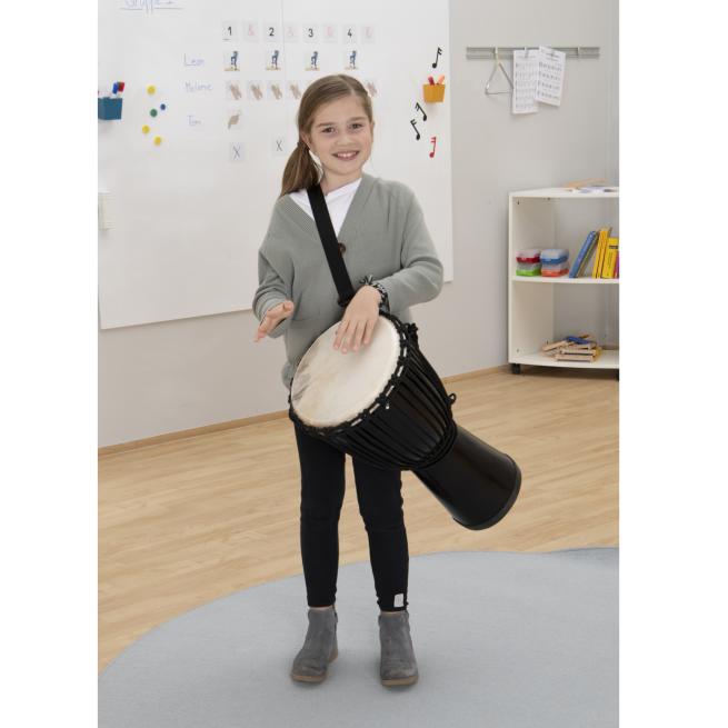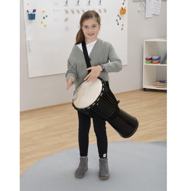 Die Djembe können auch kleinere Schüler tragen und spielen. Durch das geringe Gewicht ist die Djembe trotz ihrer Größe leicht in der Handhabung. Das ist von Vorteil, wenn sich Ihre Schüler zum Rhythmus bewegen sollen. Dabei ist der Klang hervorragend. Der Resonanzkörper kann sich mit jeder Holzdjembe messen. Fiberglas garantiert einen langen gleichbleibenden Klang. Es ist sehr stabil und langlebig.