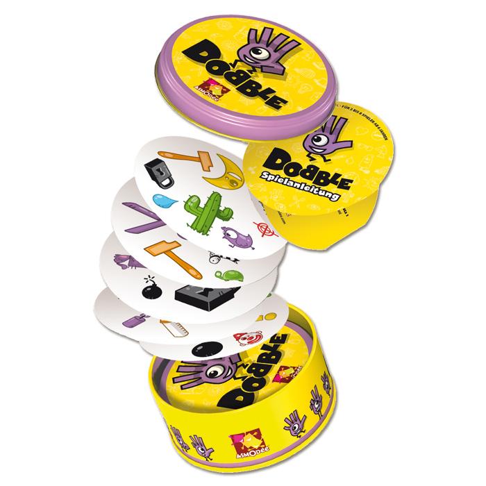 Hier sind schnelle Reaktionen gefragt! Jede der 55 Spielkarten zeigt 8 verschiedene Symbole. Wer findet als Erster das passende Symbol auf einer anderen Karte? Dobble bietet temporeichen Spielspaß in 5 Varianten.