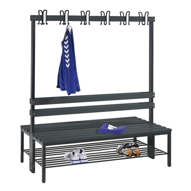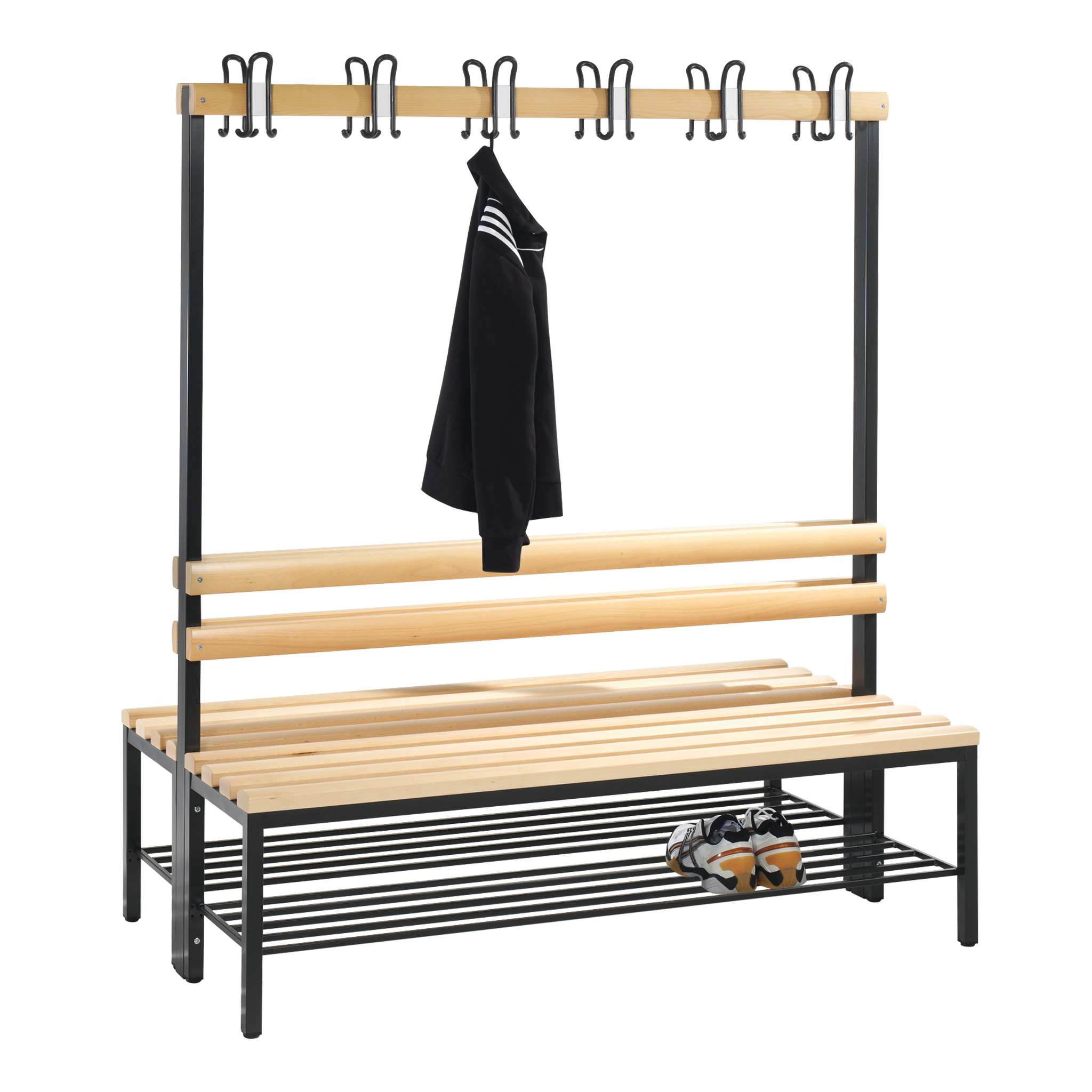 Doppelseitige Garderobenbank mit 4 Füßen und Hakenleiste mit 2x 4 Doppelhaken, ohne Schuhrost