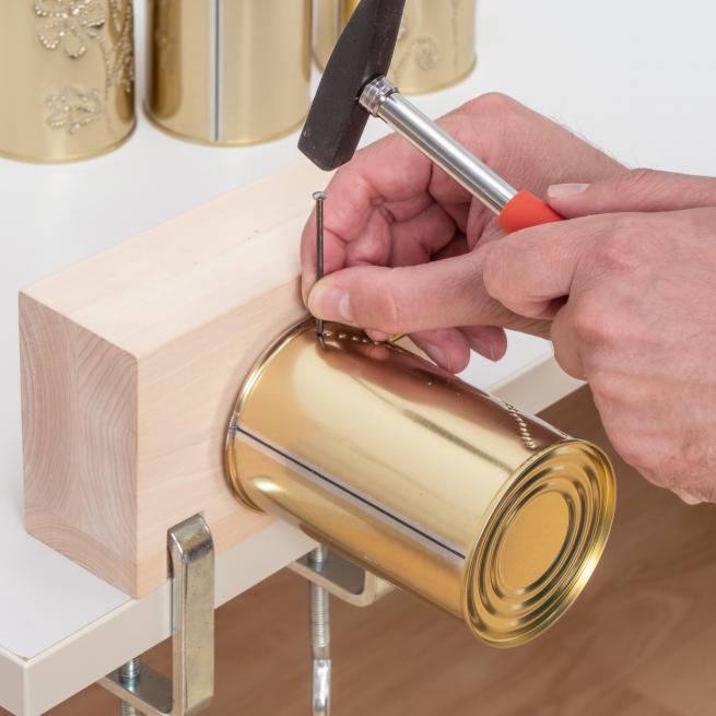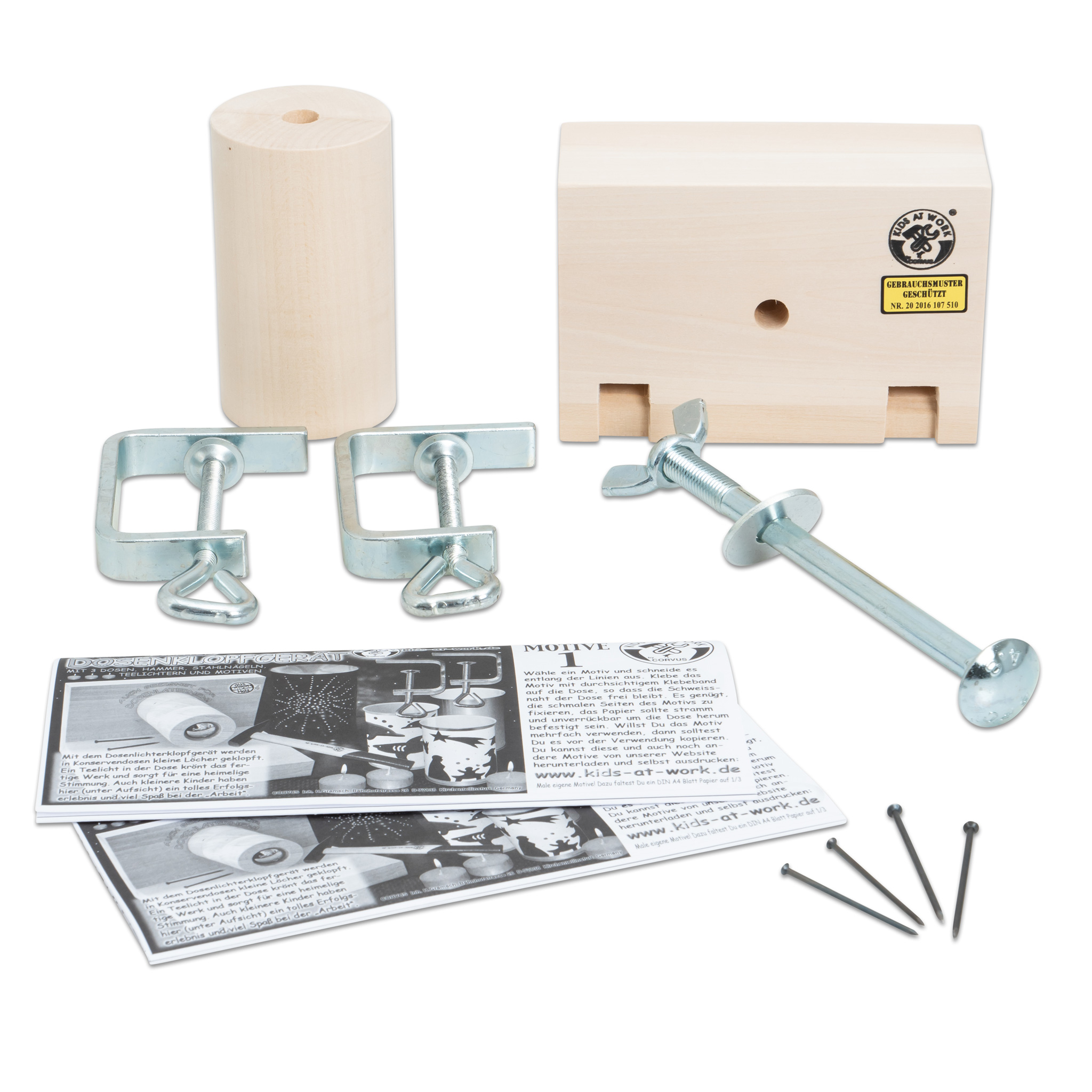 Mit dem Dosenklopfgerät können Sie aus Dosen (bitte separat bestellen) tolle Windlichter mit schönen Lichteffekten selbst herstellen. Optimal für den Werkunterricht oder das nächste Bastelprojekt. Das Dosenklopfgerät befestigen Sie mit den beiden Schraubzwingen z. B. an Ihrer Werkbank oder einer breiten Arbeitsplatte.