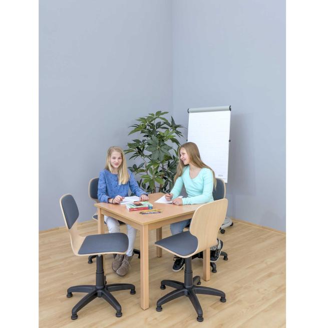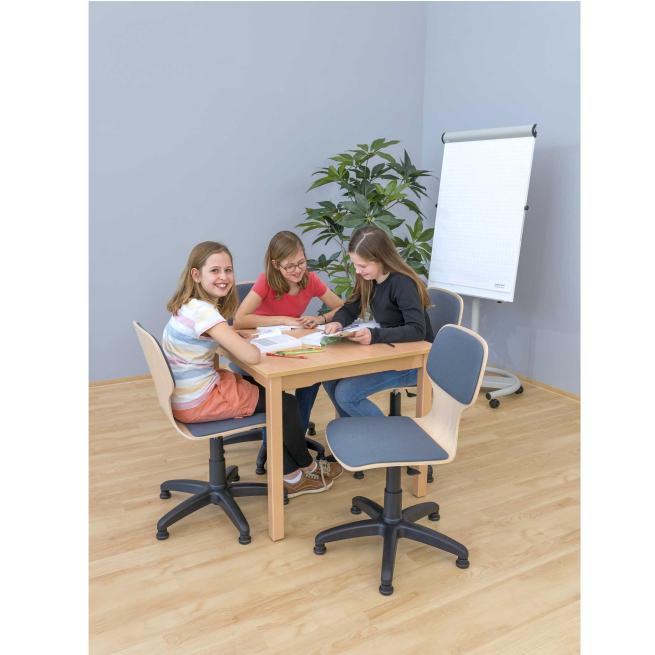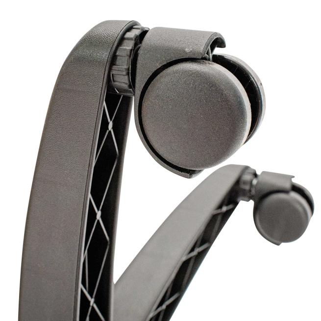 5-strahliger Fuß in schwarz aus hochwertigem Kunststoff mit Hart- oder Teppichbodenrollen. Sitz aus Sperrholz.