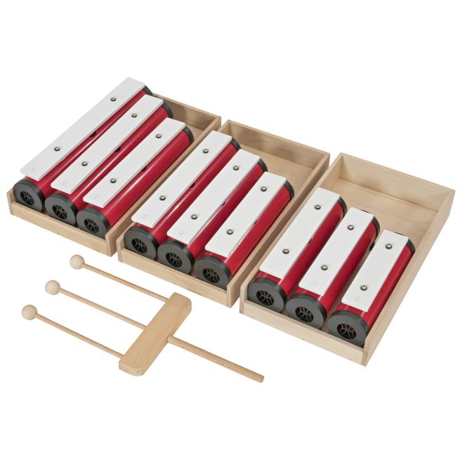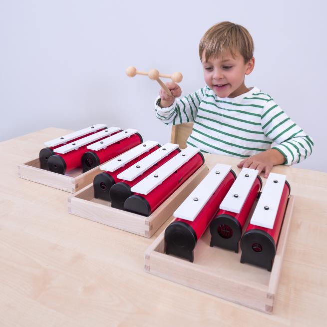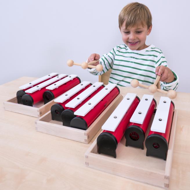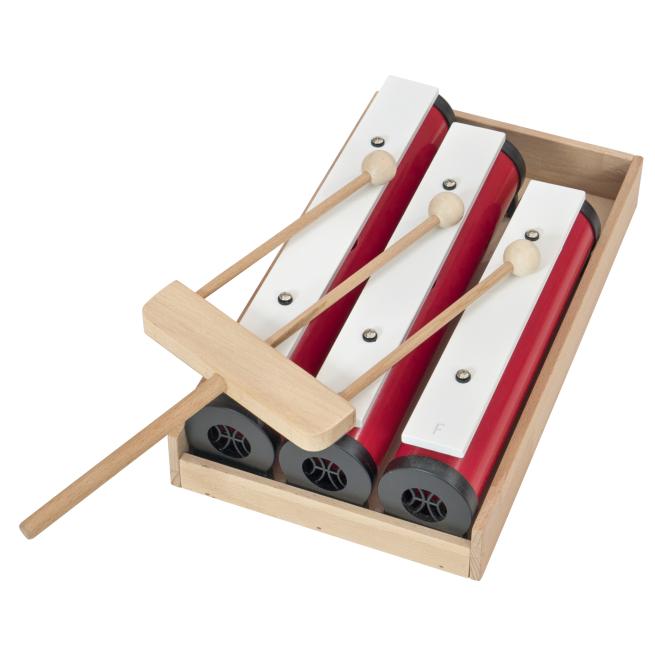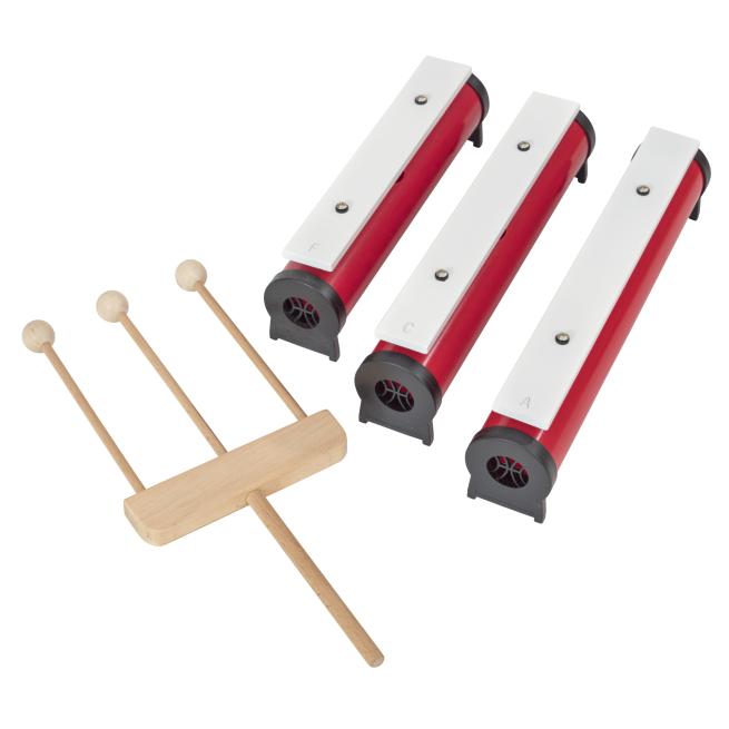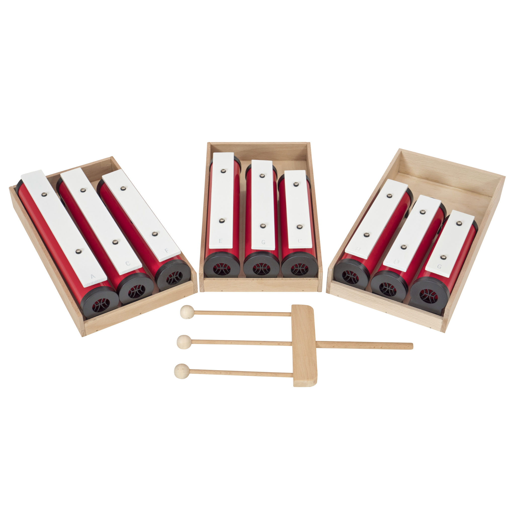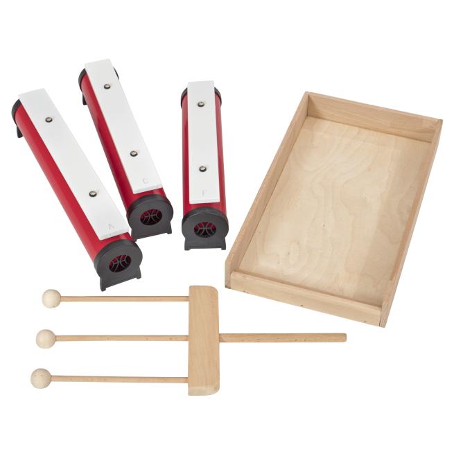 Anschaulich Akkorde lernen gelingt Ihren SuS, indem sie je 3 Round-Sound-Tubes in die 3 Holzboxen legen. Dann lassen Sie sie mit den speziell entwickelten Dreikopfschlägeln erklingen. Die entsprechende Note steht auf der Klangplatte der Klangbausteine.