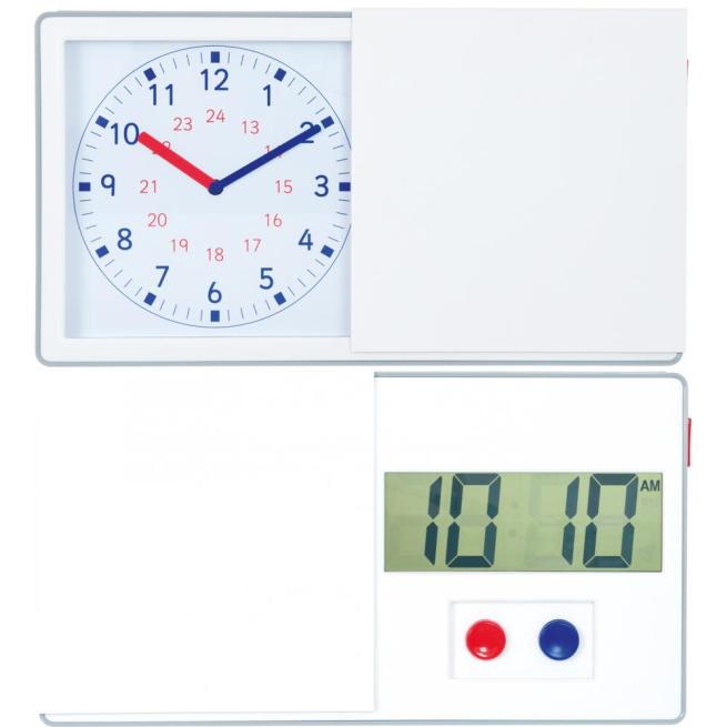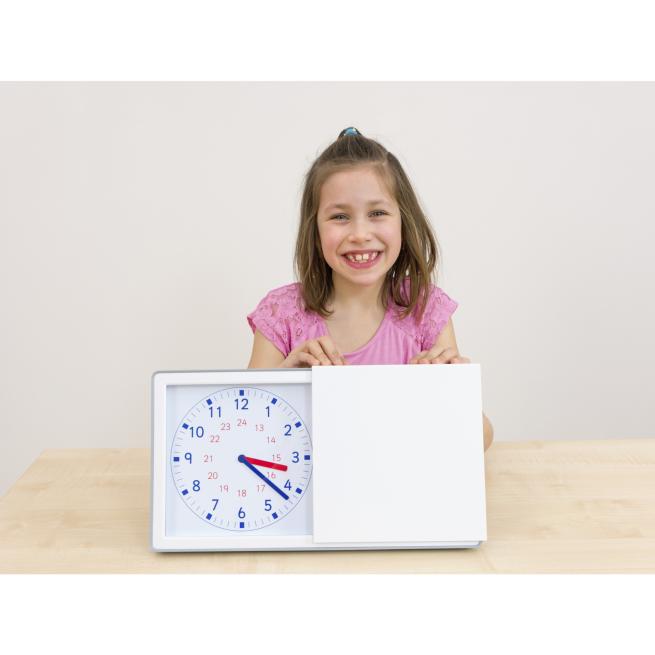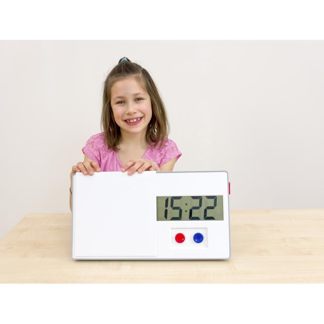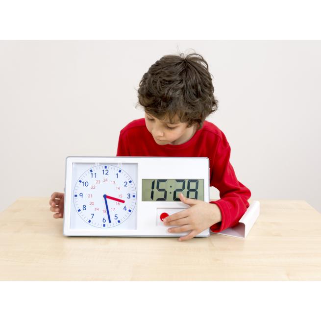 Mit der anologen Uhrzeit, dem Zifferblatt sowie großem und kleinem Zeiger können sich Kinder die Uhrzeit besser vorstellen. Die digitale Uhrzeit können sie leichter lesen. Die Lernuhr zeigt beide Darstellungen auf einen Blick. Per Knopfdruck stellen Sie die gewünschte Zeit ein und mit dem Schiebedeckel können Sie jeweils eine Seite der Uhr abdecken. Stellen Sie Aufgaben zum Einüben der Uhrzeit.