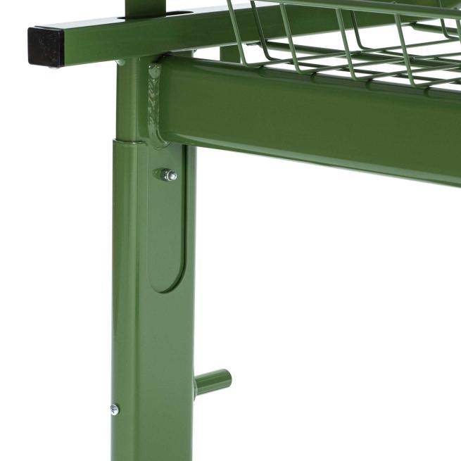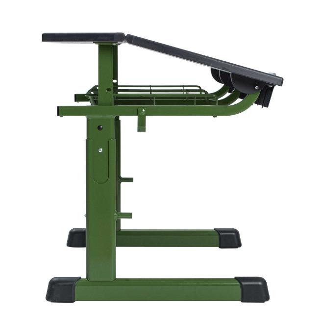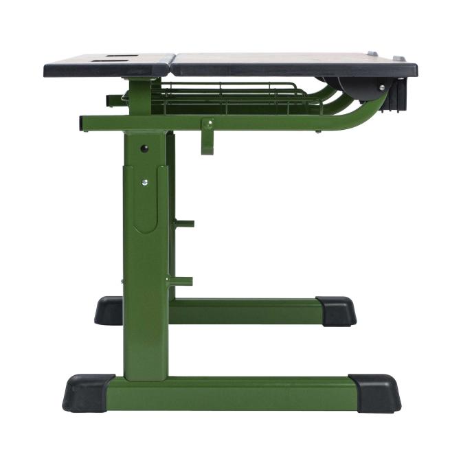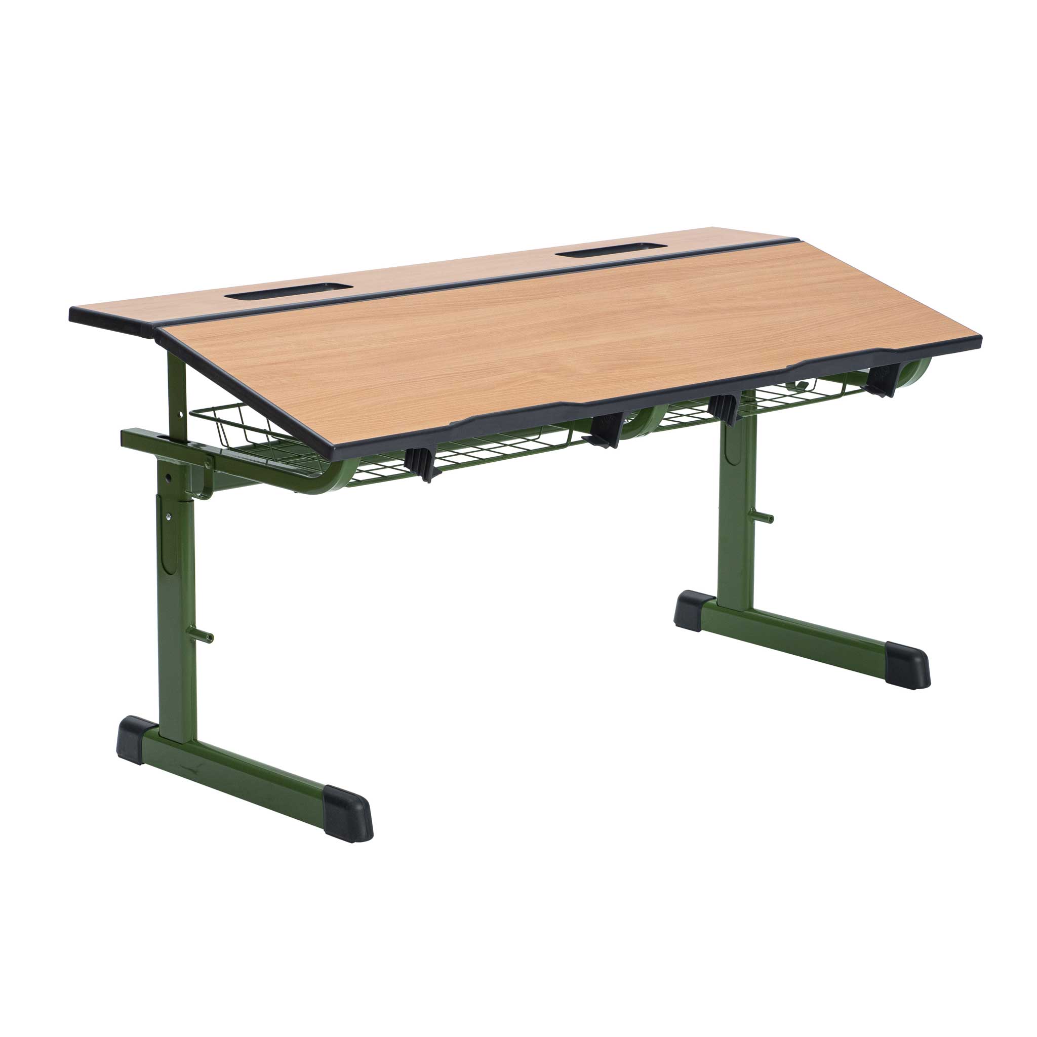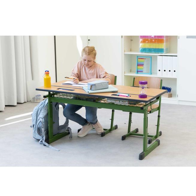 Mit verstellbarer Tischplatte: flach und schräg einstellbar. Eine Abrutschsicherung an der vorderen Tischkante sorgt dafür, dass auch bei geneigter Position nichts zu Boden fällt. Die Drahtkorbablage unter dem Tisch bietet viel Stauraum für Hefte und Bücher.