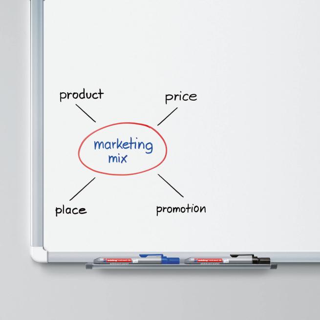 Diese edding Whiteboard-Marker bringen Tempo und Ordnung in Besprechungen, Unterricht und Gruppenarbeit. Die praktische Druckknopfmechanik fährt die Spitze mit nur einer Hand ein und aus. Das spart Zeit, hält den Arbeitsfluss stabil und erspart die Suche nach verlorenen Kappen. Die leuchtenden Farben Schwarz, Rot, Blau und Grün heben Inhalte klar hervor und strukturieren Tafelbilder, Notizen oder Präsentationen auf einen Blick. Die schnell trocknende, geruchsarme Tinte lässt sich von Whiteboards aus Glas, Emaille und Melamin rückstandsfrei entfernen.
