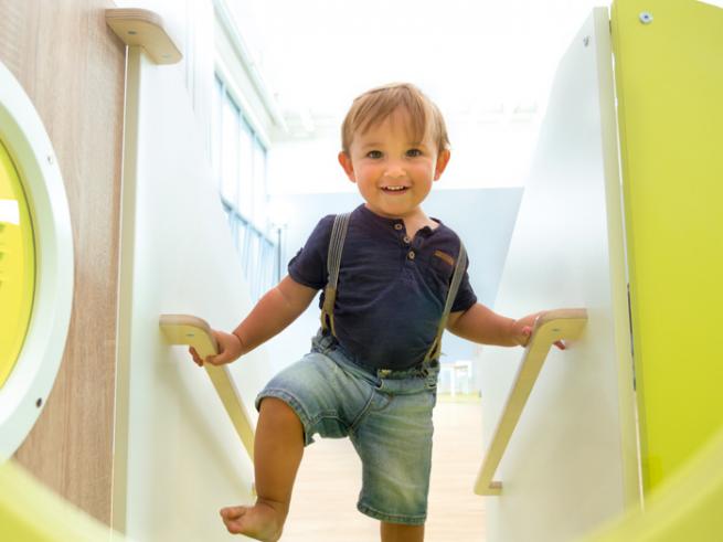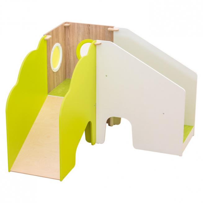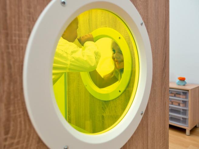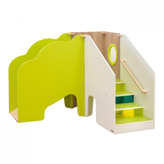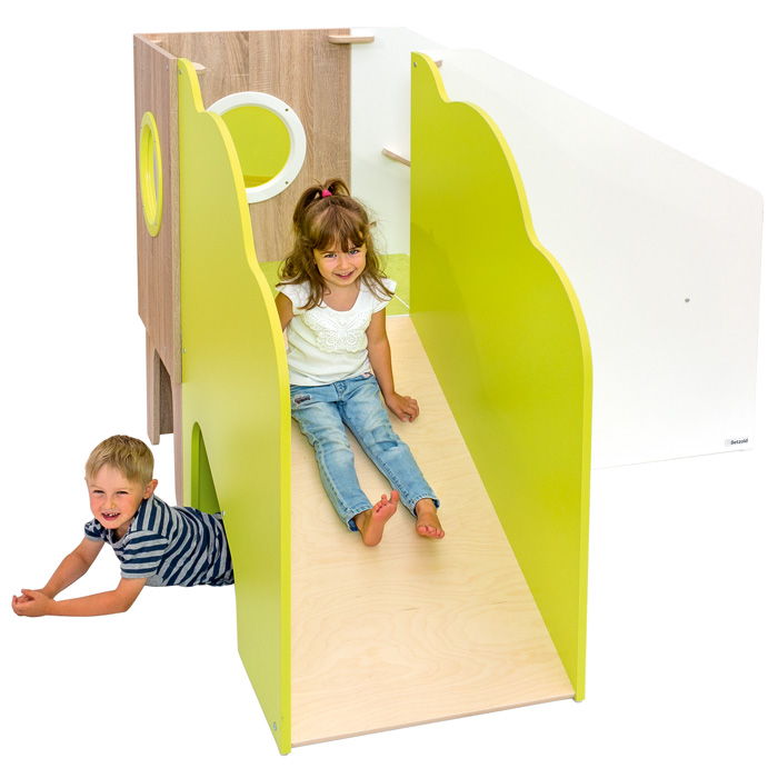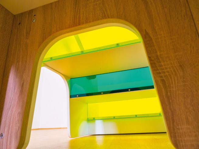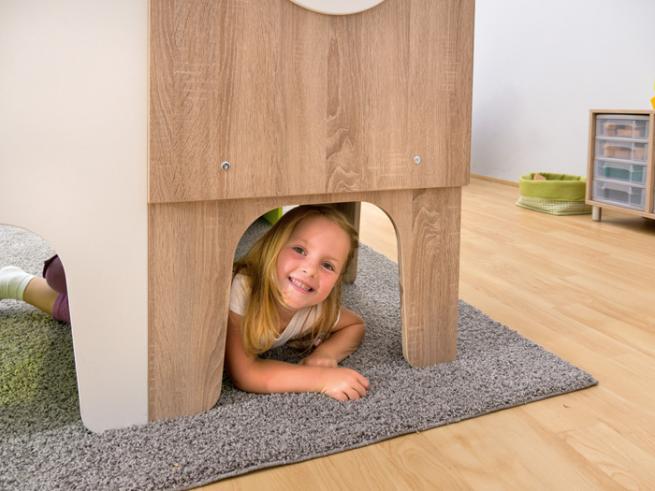 Die Spielburg ist für Kinder das absolute Highlight. Und damit das Spielen auch barfuß Spaß macht, sind die Stufen des Treppenaufgangs mit hellgrünem Tretford Teppich belegt. Handläufe an beiden Seiten helfen den Kleinen, selbstständig neue Räume zu entdecken. Das grüne Acrylglas an den Stufen lässt das Licht in den Krabbelhöhlen magisch schimmern. Durch die großen Bullaugen beobachten die Kinder, was um sie herum im Gruppenraum geschieht.