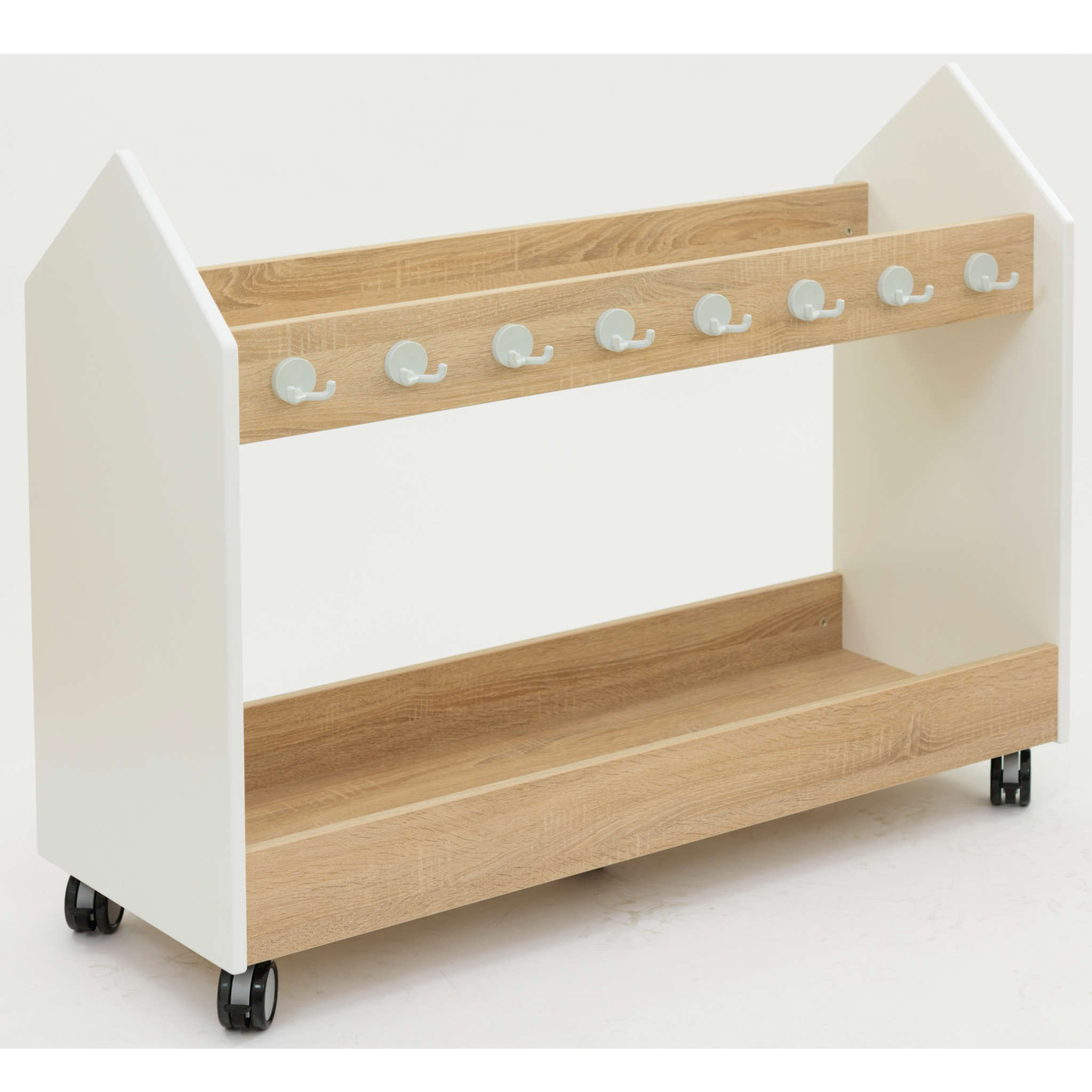 Der EduCasa Taschenwagen sorgt im Nu für Ordnung und Übersicht in Ihrem Eingangsbereich. Mit seinen praktischen Ablagen und Doppelhaken bietet er jede Menge Stauraum für Jacken, Taschen, Mützen, Schals und Rucksäcke. Der mobile Wagen ist auf beiden Seiten mit je 8 Doppelhaken ausgestattet, die durch die kindgerechte Höhe von ca. 52 cm gut erreichbar sind. Dank seines ansprechenden Haus-Designs fügt sich der Taschenwagen harmonisch in jedes Umfeld ein und schafft dabei eine freundliche, aufgeräumte Atmosphäre. Wählen Sie zwischen den frischen Farben Limette, Petrol oder schlichtem Weiß, um Ihrem Raum einen modernen, aber gleichzeitig praktischen Touch zu verleihen.