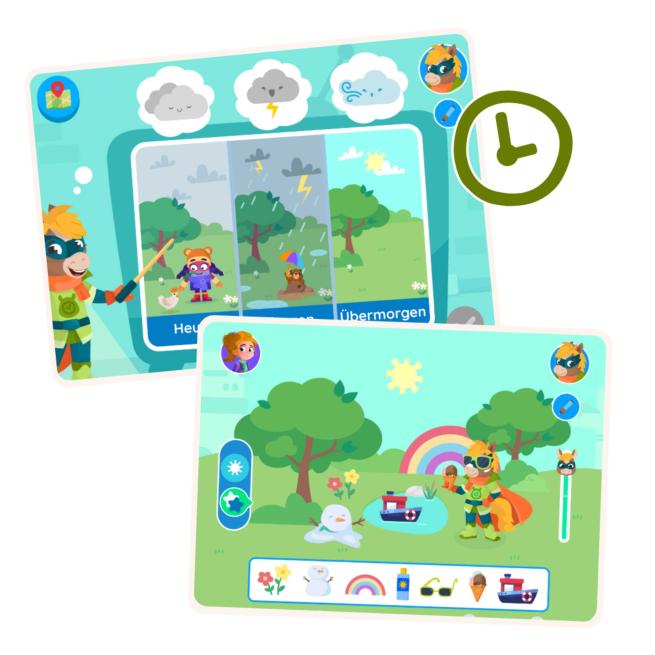 Die EDURINO Lern-App laden Sie kostenlos aus den gängigen Stores herunter. Sobald das Kind die Spielfigur Pferd Alex auf das Endgerät stellt, erkennt die App diese und startet das entsprechende Lernspiel. Gemeinsam mit Alex beginnt die spannende Reise in die Welt der Jahreszeiten, des Wetters und des Kalenders. Spielerisch lernen Kinder Wetterphänomene, Jahreszeiten und Kalender verstehen. Sie entdecken, wie sich Monate, Tage und Jahreszeiten aufeinander beziehen. Vorschulübungen sind z. B. in spannende Missionen eingebettet. Mithilfe des Eingabestifts bedienen die Kinder die App und die Übungen darin. Gleichzeitig trainieren sie die korrekte Stifthaltung. Eingabestift und Lerninhalte sind mit Ergotherapeuten und Pädagogen entwickelt worden. Ab 4 Jahren.