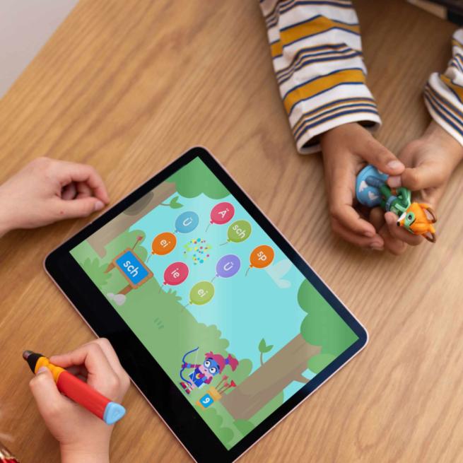 Die EDURINO Lern-App laden Sie kostenlos aus den gängigen Stores herunter. Sobald das Kind die Spielfigur Fuchs Mika auf das Endgerät stellt, erkennt die App diese und startet das entsprechende Lernspiel. Gemeinsam mit Mika beginnt die spannende Reise in die Welt der Wörter, Sätze und Geschichten. Spielerisch lernen Kinder Buchstaben, Laute und Satzstrukturen kennen. Dabei entdecken sie Freude am Lesen, Schreiben und an Geschichten. Vorschulübungen sind z. B. in spannende Missionen eingebettet. Mithilfe des Eingabestifts bedienen die Kinder die App und die Übungen darin. Gleichzeitig trainieren sie die korrekte Stifthaltung. Eingabestift und Lerninhalte sind mit Ergotherapeuten und Pädagogen entwickelt worden. Ab 4 Jahren.