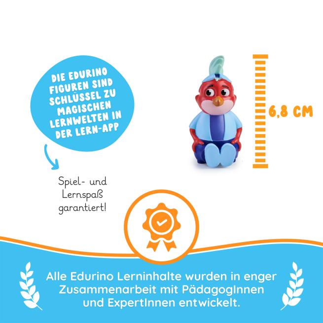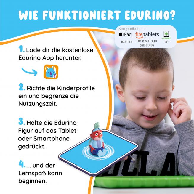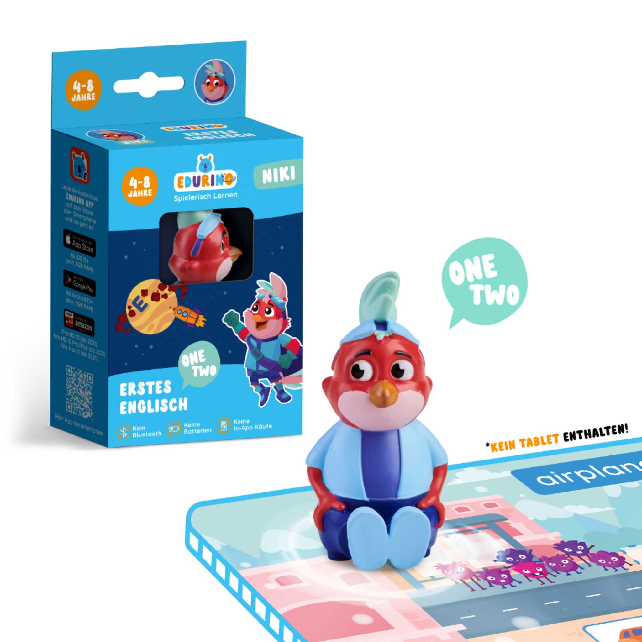 Die EDURINO Lern-App laden Sie kostenlos aus den gängigen Stores herunter. Sobald das Kind die schlaue Spielfigur Vogel Niki auf das Endgerät stellt, erkennt die App diese und startet das entsprechende Lernspiel. Gemeinsam mit Niki beginnt die spannende Reise in die Welt der englischen Sprache. Spielerisch lernen Kinder die Grundkompetenzen fürs Englischlernen. Dabei entdecken sie spielerisch einen Grundwortschatz mit über 150 Wörtern und Phrasen kennen. Vorschulübungen sind z. B. in spannende Missionen eingebettet. Mithilfe des Eingabestifts bedienen die Kinder die App und die Übungen darin. Gleichzeitig trainieren sie die korrekte Stifthaltung. Eingabestift und Lerninhalte sind mit Ergotherapeuten und Pädagogen entwickelt worden. Ab 4 Jahren.