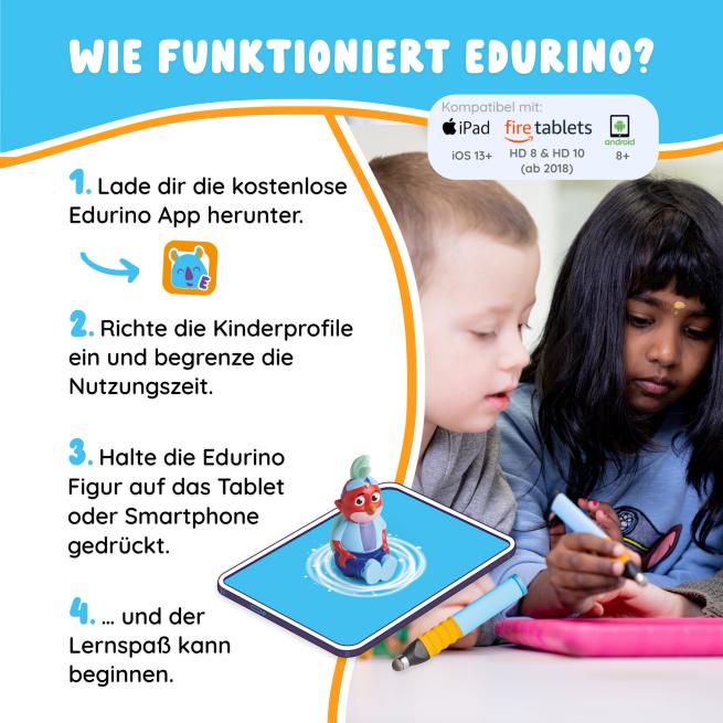 Digitales Lernen zum Anfassen. In der Welt von EDURINO entdecken Kinder mithilfe von Eingabestift, Spielfigur und App, wie spielend leicht das Englischlernen funktioniert. Die EDURINO Lern-App laden Sie kostenlos aus den gängigen Stores herunter. Sobald das Kind die schlaue Spielfigur Vogel Niki auf das Endgerät stellt, erkennt die App diese und startet das entsprechende Lernspiel. Gemeinsam mit Niki beginnt die spannende Reise in die Welt der englischen Sprache. Spielerisch lernen Kinder die Grundkompetenzen fürs Englischlernen. Dabei entdecken sie spielerisch einen Grundwortschatz mit über 150 Wörtern und Phrasen kennen. Vorschulübungen sind z. B. in spannende Missionen eingebettet. Mithilfe des Eingabestifts bedienen die Kinder die App und die Übungen darin. Gleichzeitig trainieren sie die korrekte Stifthaltung. Eingabestift und Lerninhalte sind mit Ergotherapeuten und Pädagogen entwickelt worden. Ab 4 Jahren.