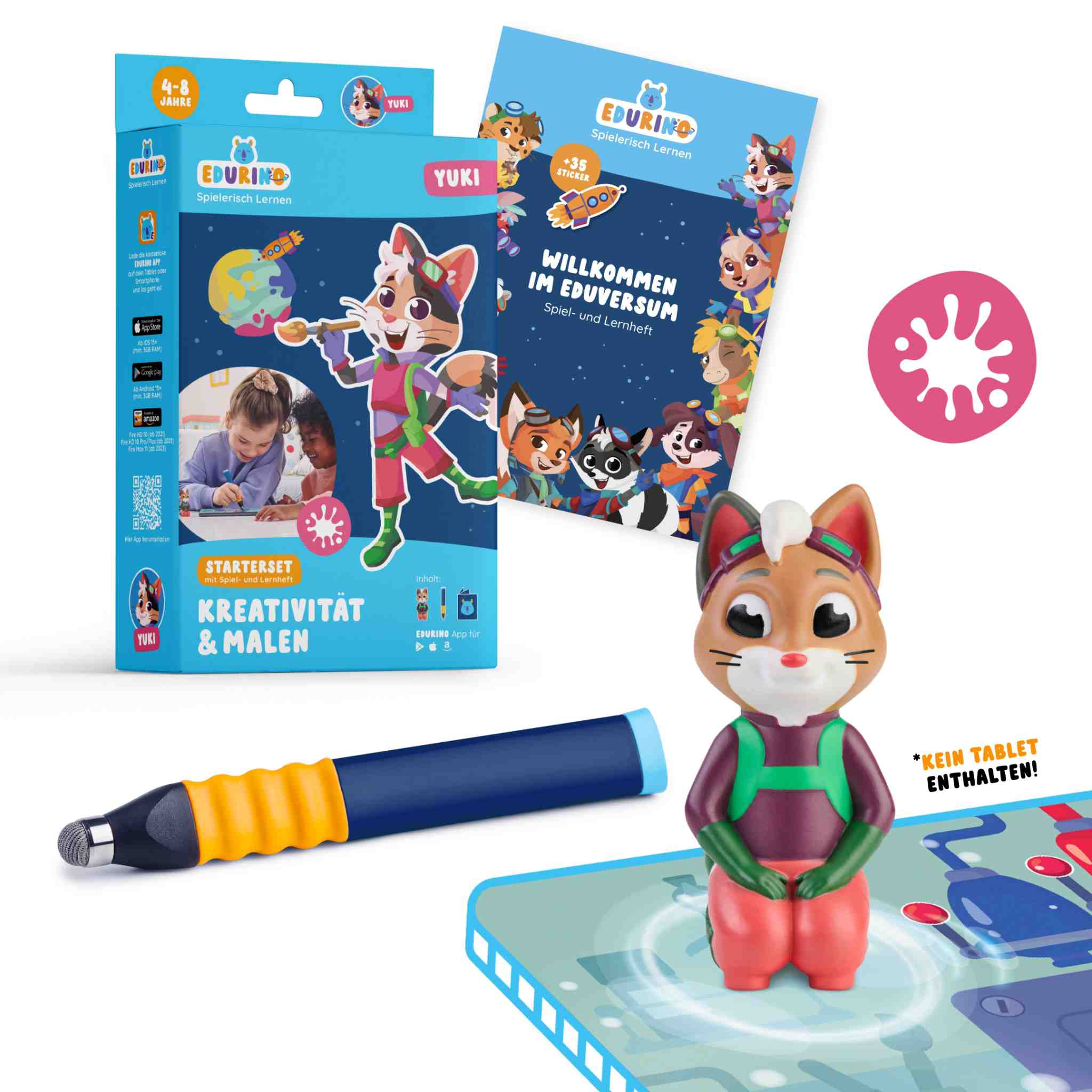 • Spielfigur Juki und den ergonomischen Eingabestift senden wir an Ihre angegebene Adresse• EDURINO App: einfach kostenlos herunterladen aus dem App Store, Google Playstore und Amazon Appstore