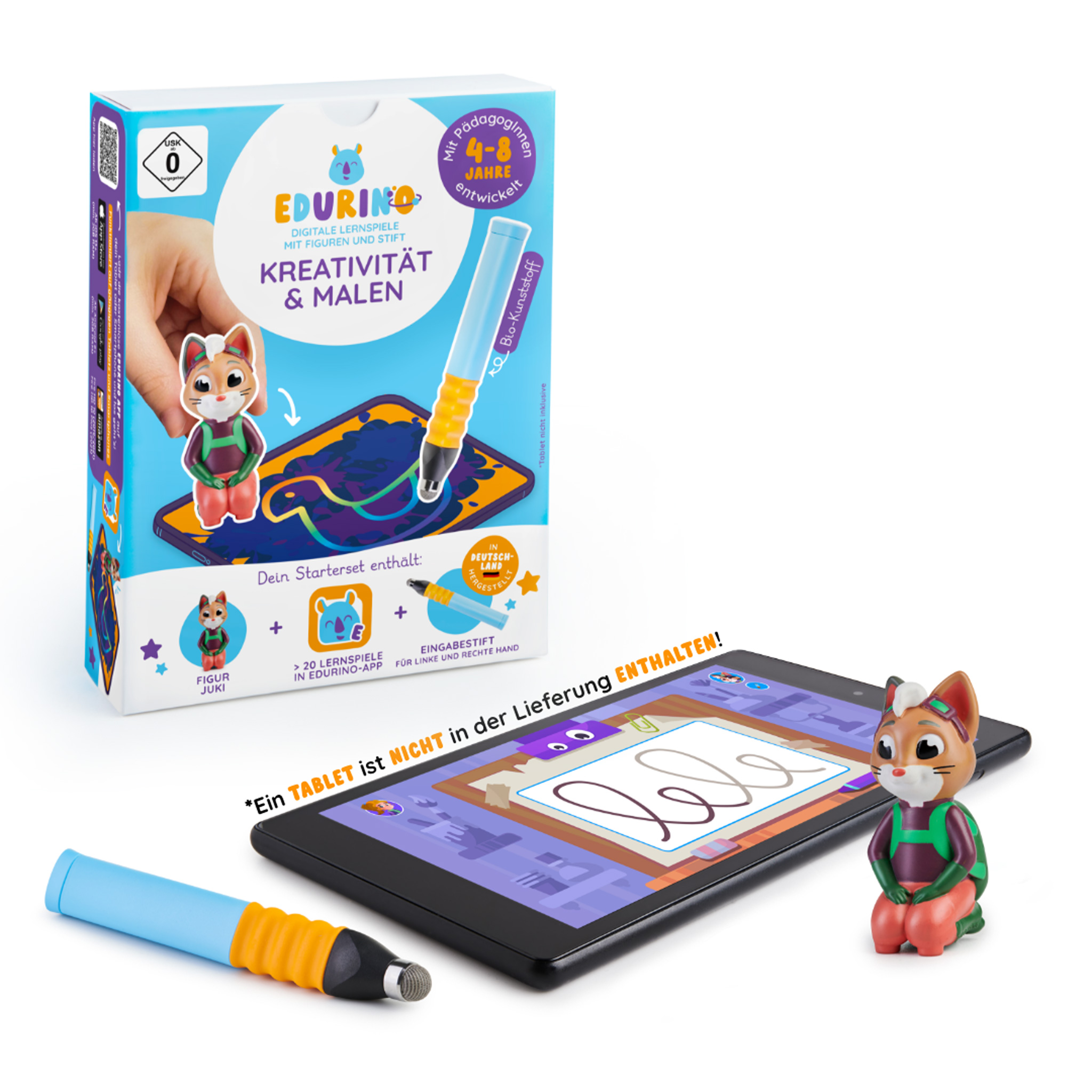 Die EDURINO Lern-App laden Sie kostenlos aus den gängigen Stores herunter. Sobald das Kind die schlaue Spielfigur Juki auf das Endgerät stellt, erkennt die App diese und startet das entsprechende Lernspiel. Gemeinsam mit Juki beginnt die spannende Reise in die Welt der Worte. Spielerisch lernen Kinder die Grundkompetenzen fürs Malen und fördern ihre Kreativität. Dabei sind z. B. Farbenlehre und Malexperimente in spannende Missionen eingebettet. Mithilfe des Eingabestifts bedienen die Kinder die App und die Übungen darin. Gleichzeitig trainieren sie die korrekte Stifthaltung. Eingabestift und Lerninhalte sind mit Ergotherapeuten und Pädagogen entwickelt worden. Ab 4 Jahren.