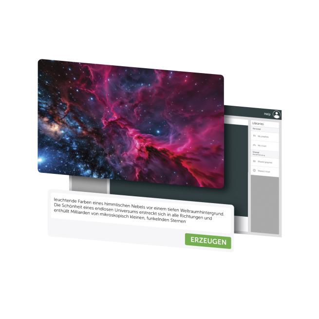 Erschaffen Sie Ihre eigenen virtuellen Unterrichtsinhalte, kinderleicht und in Windeseile. Dabei verwenden Sie zum einen eigenes Material, z. B. Fotos, die Sie in wenigen Schritten in beeindruckende 360°-Panoramen verwandeln. Zum anderen generieren Sie mithilfe der intuitiv bedienbaren KI individuelle und animierte VR-Inhalte, ebenfalls in der 360°-Rundumsicht. Hierfür tippen Sie Ihre Gestaltungsideen einfach in das vorgesehene Textfeld und lassen die KI eine Lernumgebung nach Ihren Vorstellungen entwerfen, vom Märchenwald bis zum Hochgebirge. Ermöglichen Sie ungeahnte räumliche Perspektiven oder kreieren Sie eine ganz besondere Lernatmosphäre.
