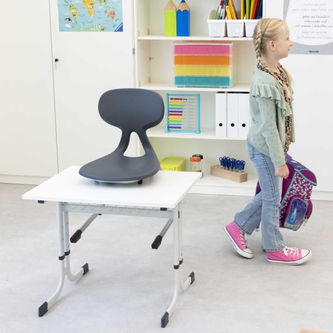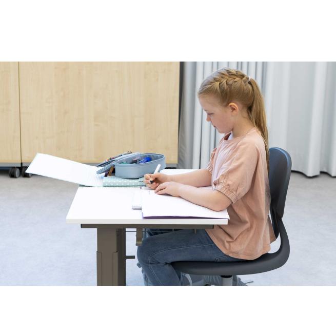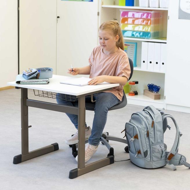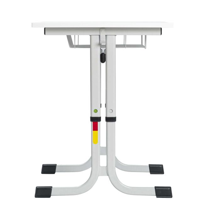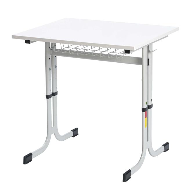 Größenangepasste und ergonomische Arbeitsplätze beugen Haltungsschäden vor und erleichtern das Lernen. Ob Einzel- oder Zweiertische: An diesen superstabilen und beständigen Tischen nehmen Ihre Schüler gern Platz. Die Höhenverstellung von 58 bis 82 cm nehmen Sie einfach mit einem Inbusschlüssel vor. An der Außenseite der Tischbeine sind die einstellbaren Höhen farblich markiert. Zudem ist die Höhenverstellung geprüft nach DIN ISO 5970. Das C-Fuß-Gestell mit Querstrebe gibt dem Tisch festen Stand. Ihre Taschen bewahren die Schüler am integrierten Haken an der Seite auf. Wählen Sie für die Tischplatte zwischen Vollkern, ABS- oder PU-Kante. Aus 10 RAL-Farben wählen Sie die Gestellfarbe. Die Drahtkorbablage ist hinten geschlossen.