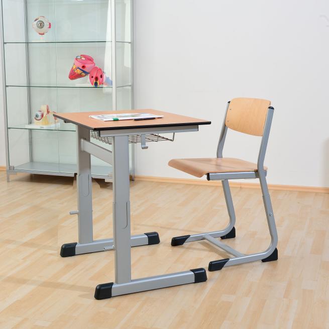 Einer-Schülertisch mit L-Fuß, Drahtkorbablage und Rollen, höhenverstellbar