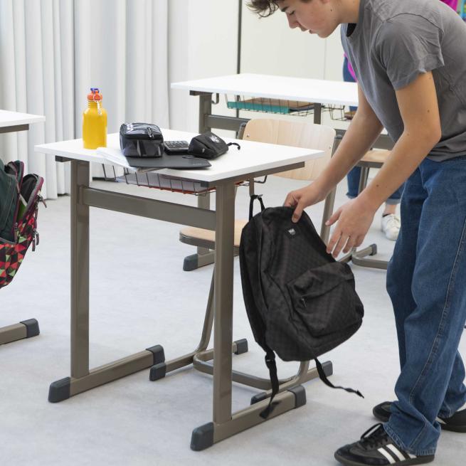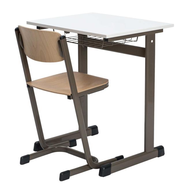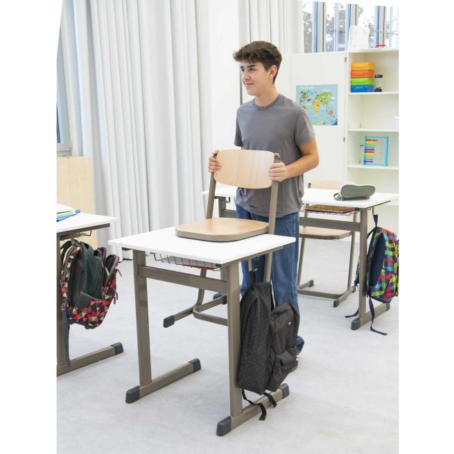 Einer-Schülertisch mit L-Fuß und Drahtkorbablage