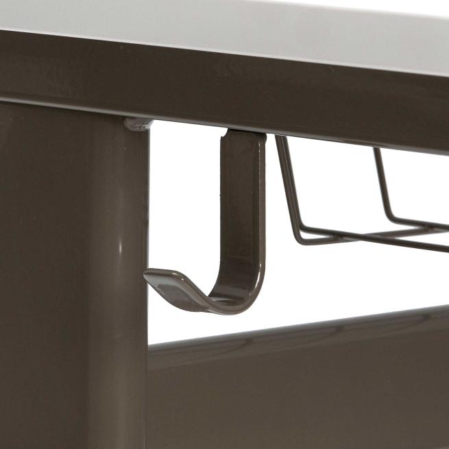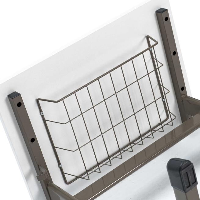 Die Tische haben einen Haken für Taschen und Drahtkorbablagen für zusätzlichen Stauraum unter dem Tisch.