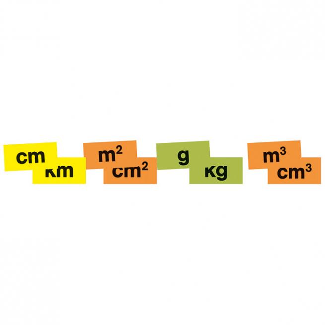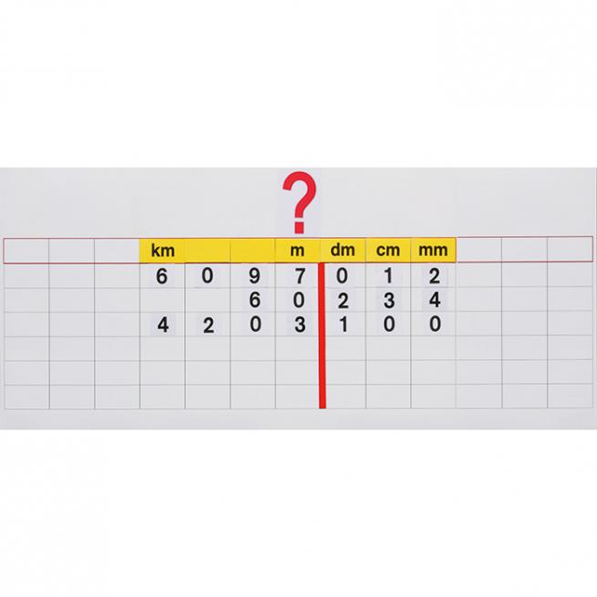 Längen, Volumen und Gewicht bildhaft umrechnen. Die magnetische Tabelle haften Sie einfach an die Tafel. Über die gesuchte Einheit platzieren die Kinder das Fragezeichen. Den umzurechnenden Wert setzen sie mit den Zahlenkärtchen ein und legen dann den Kommabalken rechts an. Wer z. B wissen will, wie viele Meter 1 km sind, wird so direkt sehen, dass es 1000 m sind.