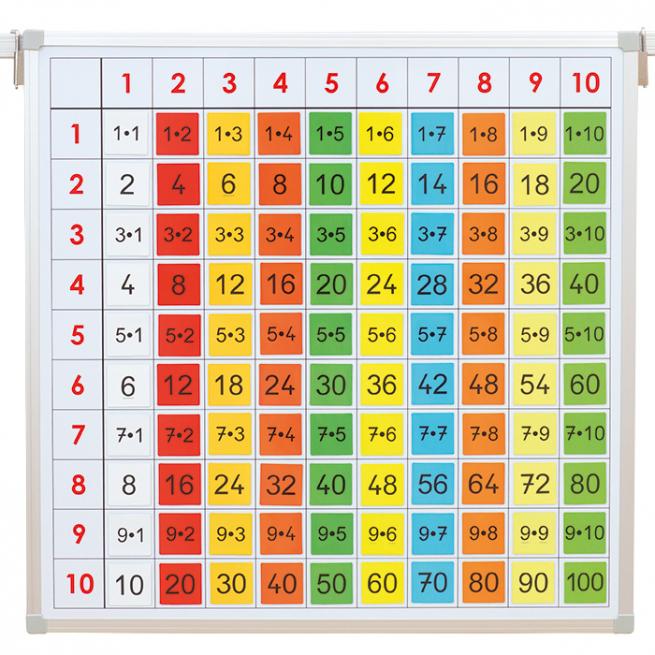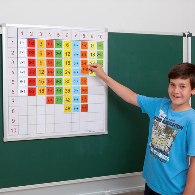 Magnethaftende Tafel, H x B: 71 x 71 cm, mit Raster und aufgedruckter Multiplikatoren- und Multiplikanden-Leiste, 100 Magnet-Kärtchen, doppelseitig bedruckt mit 1x1-Aufgaben und Ergebnissen, beidseitig magnetisch, im Sortierkasten.