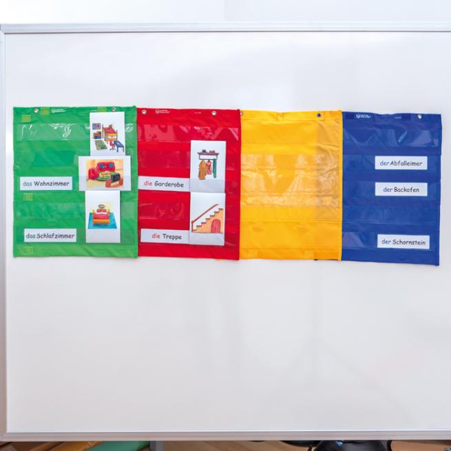 Die magnetischen Organizer befüllen Sie z. B. mit Lernkärtchen bis DIN A7 und haften sie z. B. direkt an eine Tafel. Jeder Organizer ist mit 5 Einstecktaschen ausgestattet. Dank der Klettabnäher verbinden Sie die einzelnen Organizer auch schnell miteinander. Aufbewahrungstaschen rückseitig, mit Klettverschluss.