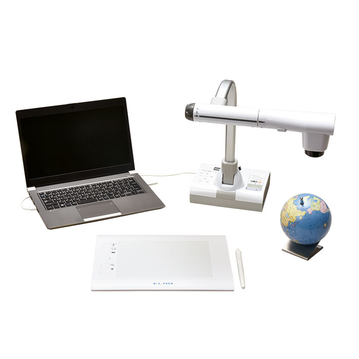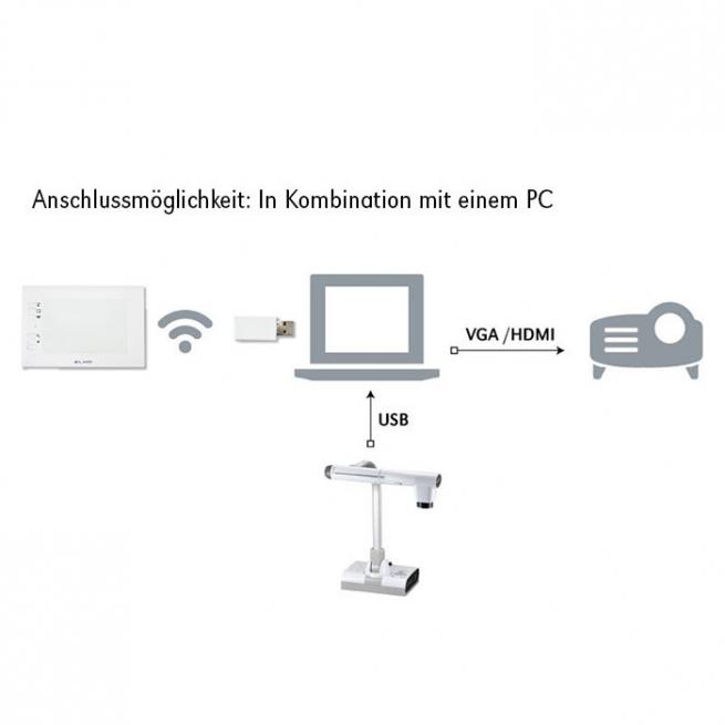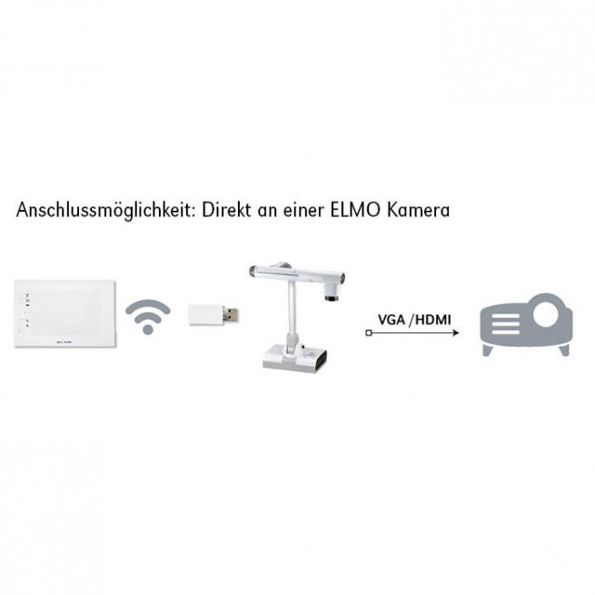 Verbinden Sie das Tablet einfach über den USB-Adapter mit dem PC oder direkt mit der ELMO Dokumentenkamera. Eine Installation weiterer Software ist nicht nötig. Zeichnen, sofort schreiben oder kommentieren Sie direkt in das Livebild der ELMO Dokumentenkamera und Ihre Anmerkungen sind für alle auf dem Screen im Klassenraum sichtbar.