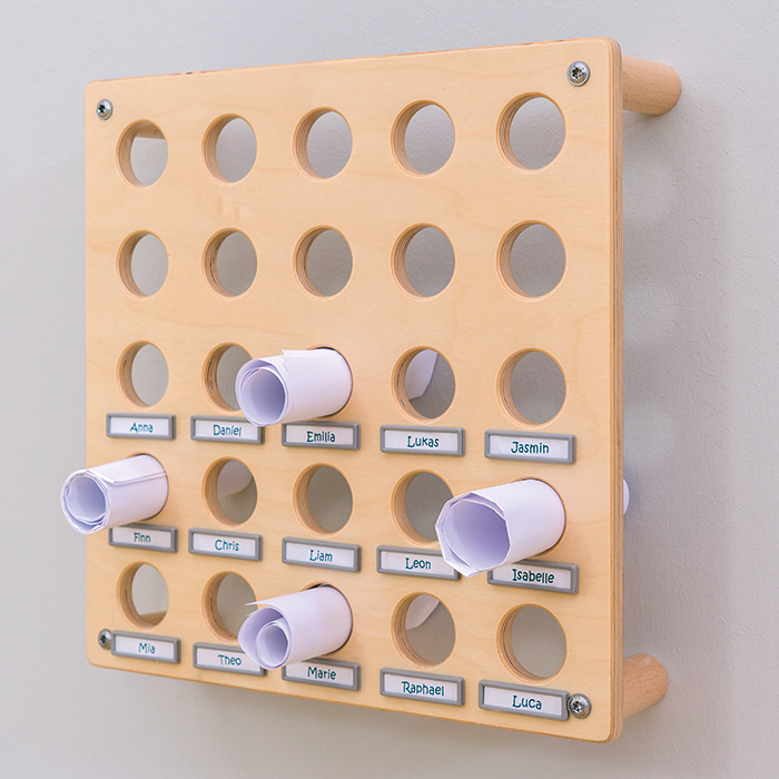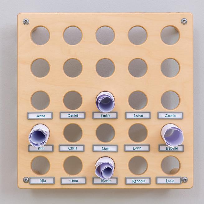 Eine Sammelstelle für die Elternpost ist da sehr praktisch. Die Nachrichten werden einfach in die runden Aussparungen mit optionalen Namenschildern gesteckt und beim Abholen entnommen. Die Namenschilder bitte extra bestellen. Zur einfachen Selbstmontage.