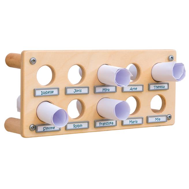 Eine Sammelstelle für die Elternpost ist da sehr praktisch. Die Nachrichten werden einfach in die runden Aussparungen mit optionalen Namenschildern gesteckt und beim Abholen entnommen. Die Namenschilder bitte extra bestellen. Zur einfachen Selbstmontage.