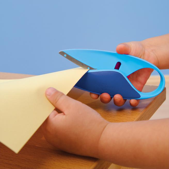 Die ergonomische Form ist ideal für erste Schneideversuche. Durch einen Federmechanismus gehen die Scherenblätter von selbst auseinander. So können sich die Kinder – ohne Kraftakt – auf das Schneiden konzentrieren.