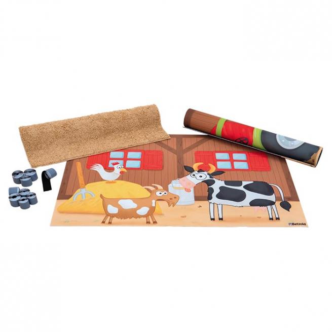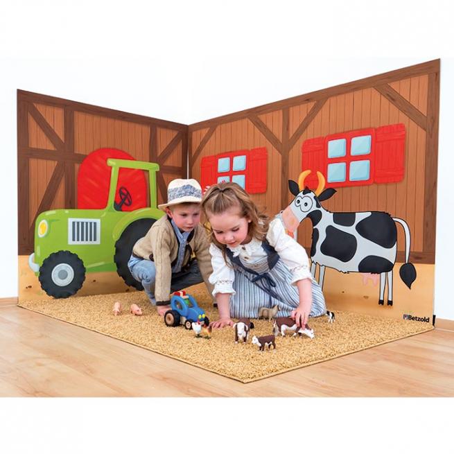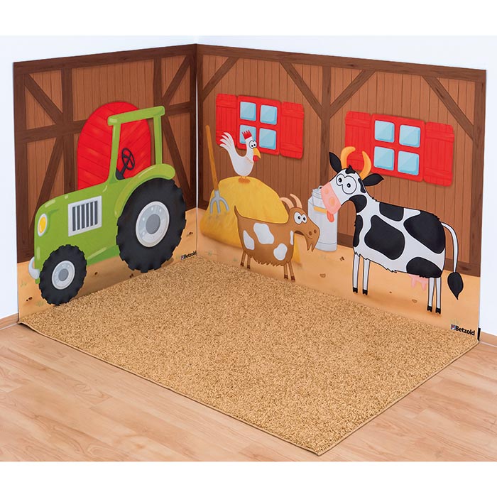 Wie in der Scheune auf dem Bauernhof fühlen sich Ihre Kinder in der Erlebnisecke. Die Tiere, der Traktor und sogar der Misthaufen verleihen dem Gruppenraum das Flair des Landlebens. Ein toller Platz für Rollenspiele, zum Vorlesen oder zur Sprachförderung. Hier bieten sich den Kindern enorm viele Erzählanlässe. Die beiden Wandteppiche befestigen Sie ganz einfach mit den beiliegenden Klettbändern an der Wand. Der kuschelige Bodenteppich mit Anti-Rutsch-Unterseite erinnert an Stroh.