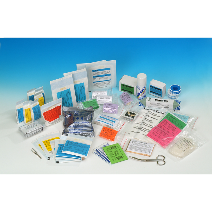 Vorgesehen für Sporthallen und speziell auf die Bedürfnisse bei Sportverletzungen ausgerichtet. Enthält u. a. Spezialverbände für Knie und Ellbogen, Kopfplatzwunden, Schürfwunden, Kältekissen, Kühlspray etc.
