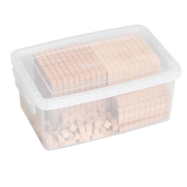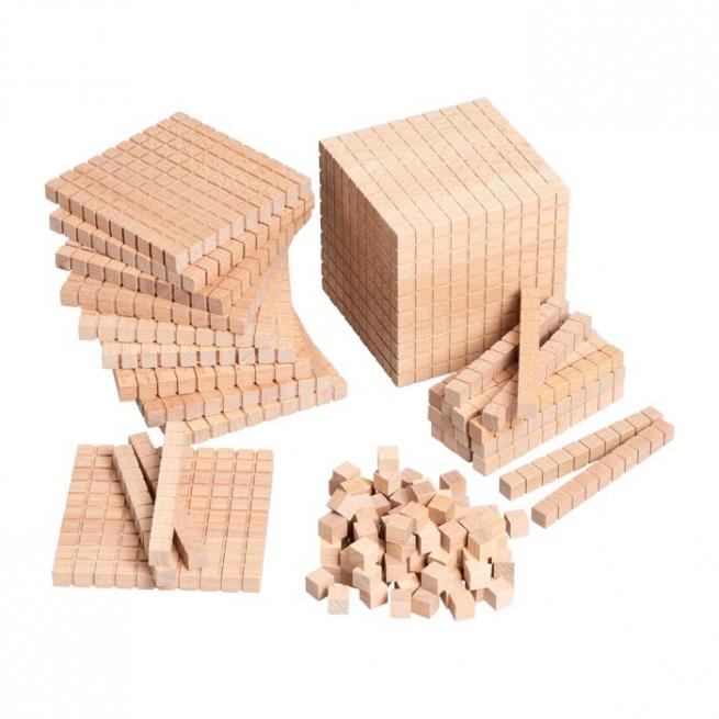 - Tausenderwürfel: 10 x 10 x 10 cm<br/>Hunderterplatte: 10 x 10 x 1 cm<br/>Zehnerstange: 10 x 1 x 1 cm<br/>Einerwürfel: 1 x 1 x 1 cm