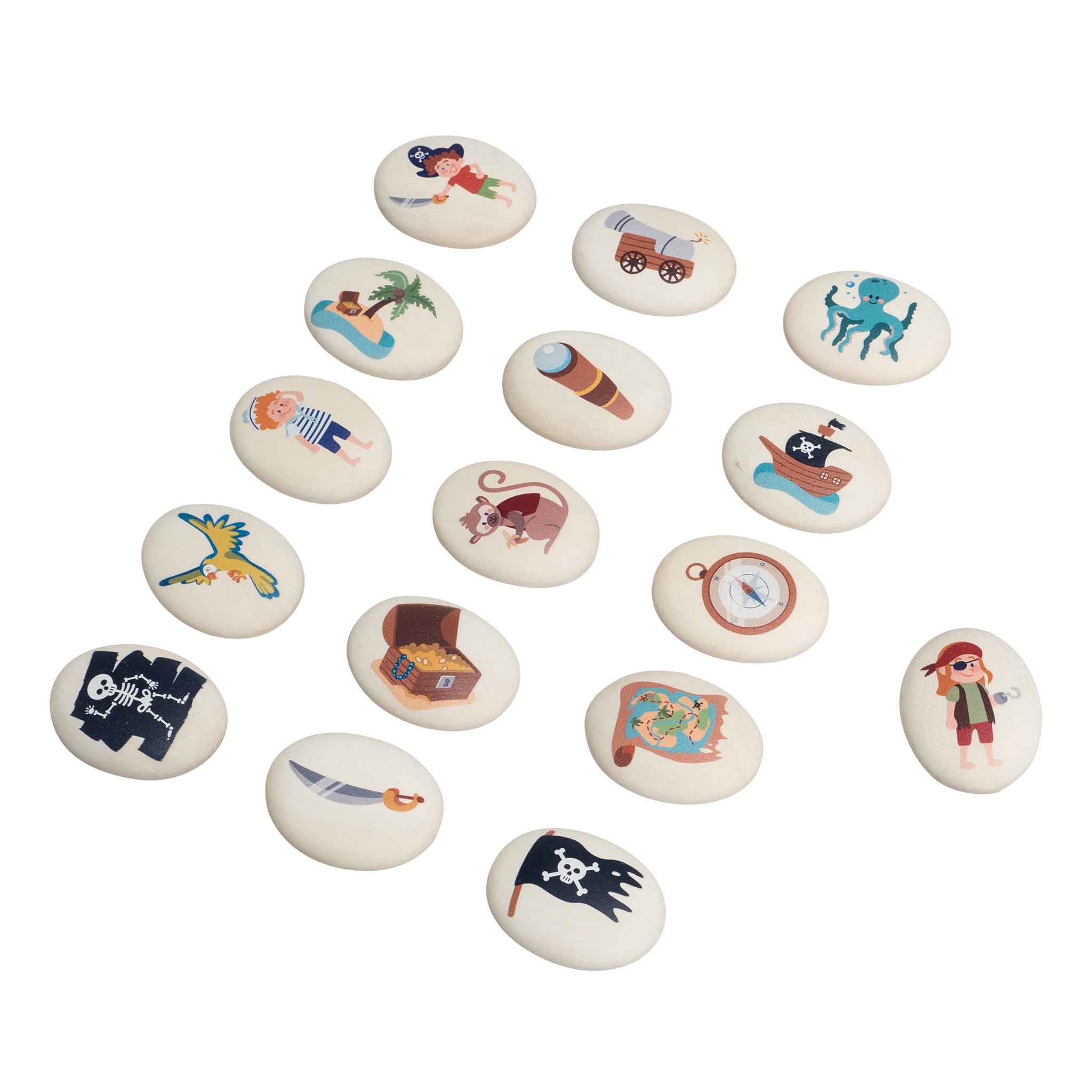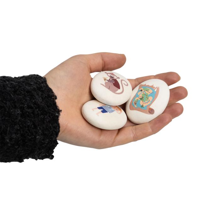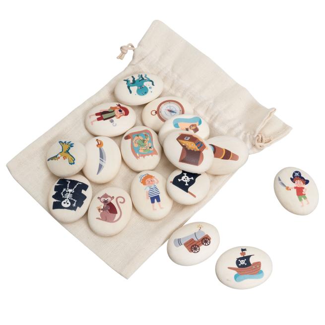 Was erleben wohl die Tiere nachts auf dem Bauernhof, bevor der Bauer sie morgens füttert? Und warum schlägt der Papagei auf dem Piratenschiff eigentlich so aufgeregt mit seinen Flügeln? Hat der Kapitän etwa zum Entern aufgerufen oder gibt es eine Meuterei? Die einzelnen Motive auf den Kieseln regen die kindliche Fantasie an. Gedächtnisspiele nach dem Ich-packe-meinen-Koffer-Prinzip fordern und fördern den kindlichen Grips.