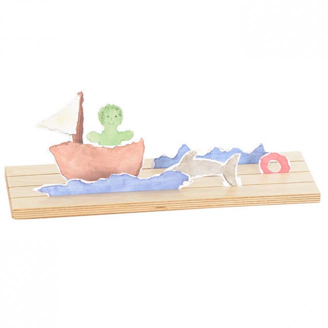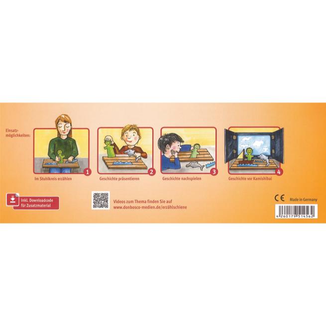 Erzählen selbst gestalten – das gelingt Ihren Kindern mithilfe der Erzählschiene und den Kulissen sowie Figuren. Die Kinder hören die Geschichte, gestalten die beiliegenden Figuren und Kulissen, stecken sie dann in die Führungsrillen der Erzählschiene und erzählen die Geschichte selbst.