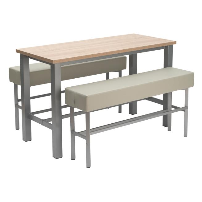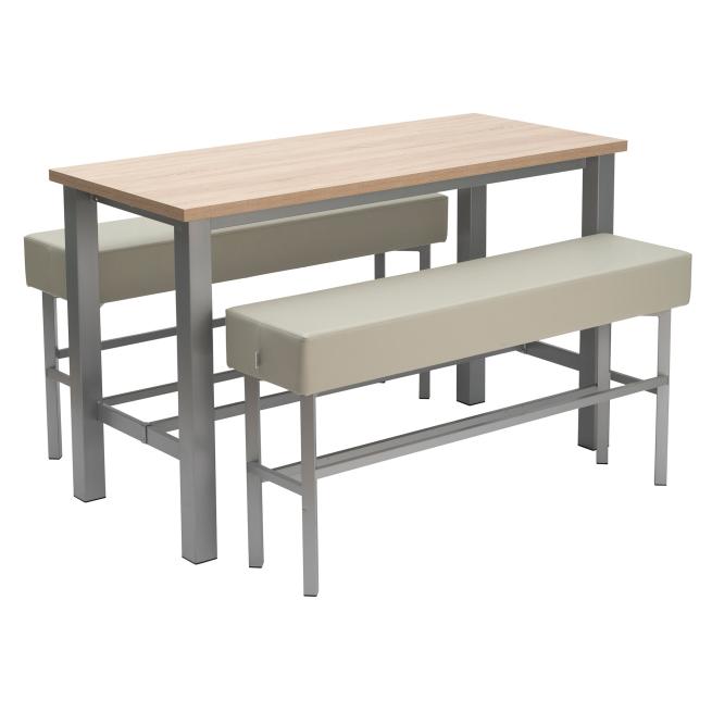 Die Tischoberflächen bestehen jeweils aus robusten, melaminharzbeschichteten, kratzfesten Spanplatten. Stellen Sie mit unseren Hochtischen, Hochtisch-Wandelementen, Ess- und Beistelltischen, Hochbänken und runden sowie quadratischen Hochstühlen (Barhockern), kleinen quadratischen und runden Hockern, Lounge-Sofas, Lounge-Sofa-Kissen und Wandpolsterelementen komfortable Bereiche fürs gemeinsame Essen und Energie-Auftanken zusammen – ganz nach Ihrem Gusto.