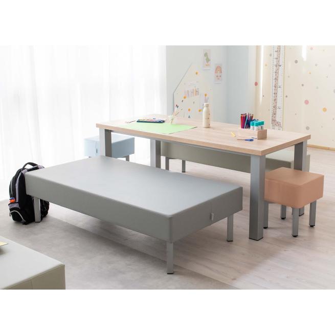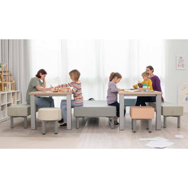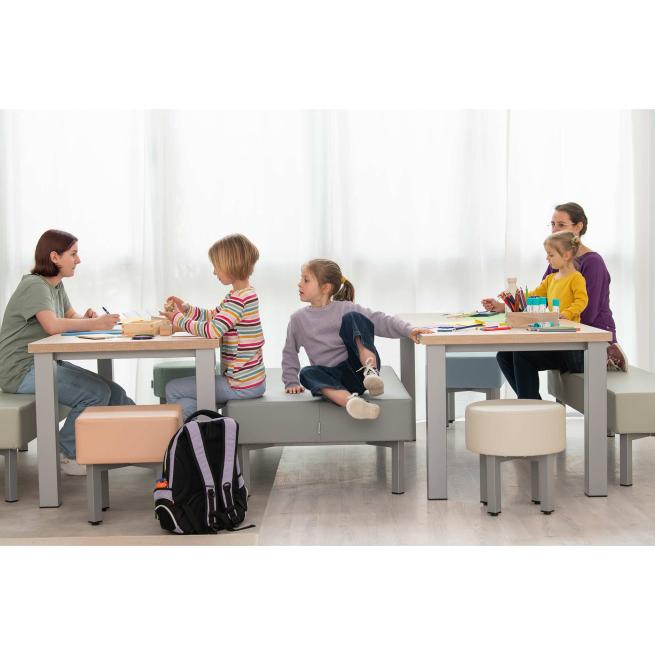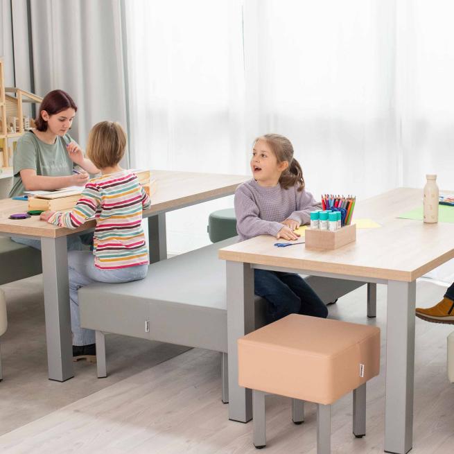 Alle Elemente der essBAR-Serie haben ein Vierkantrohrgestell aus Stahl und halten so sämtliche schulalltägliche Herausforderungen aus. Die dicke Polsterung aus festem Schaumstoff sorgt für angenehmes Lounge-Feeling bzw. hervorragenden Sitzkomfort. Zusätzlichen festen Stand gibt die Holzplatte unter dem festen Schaumstoff und die Gleiter unter den Gestellen schonen den Boden.