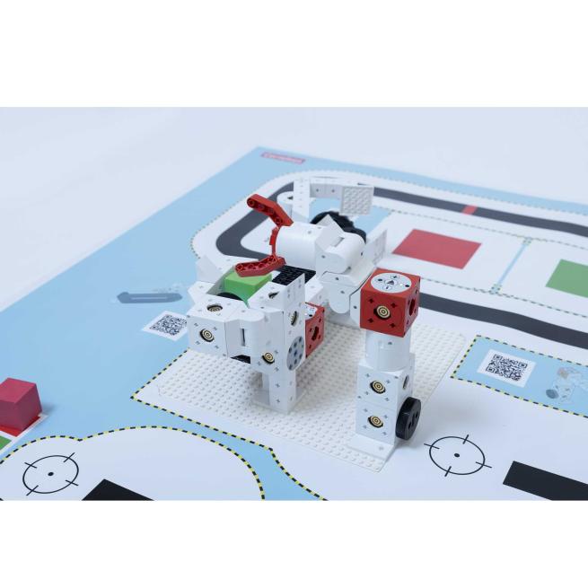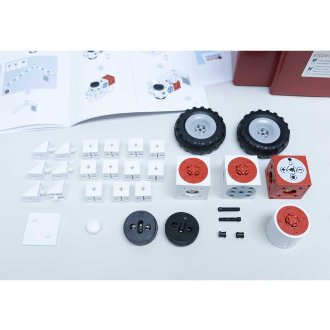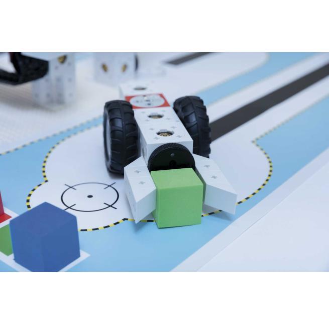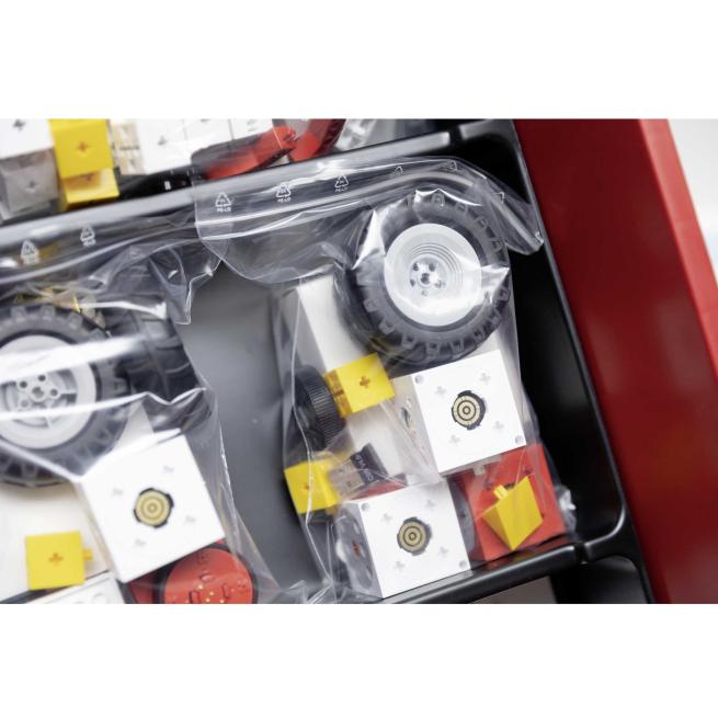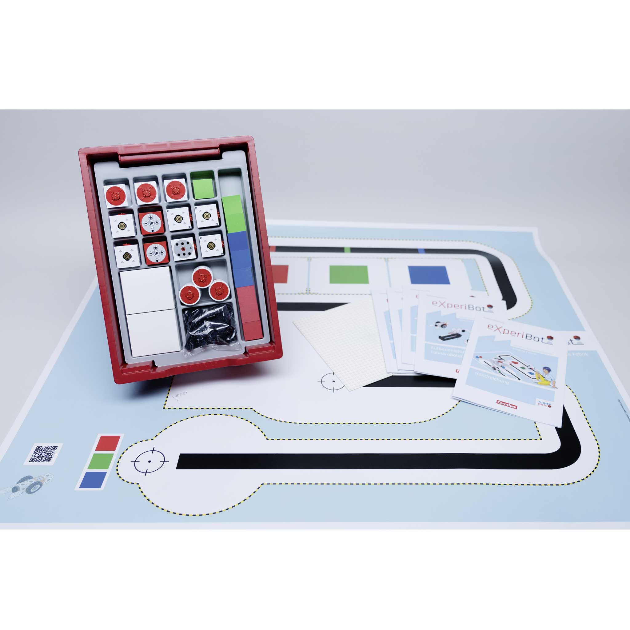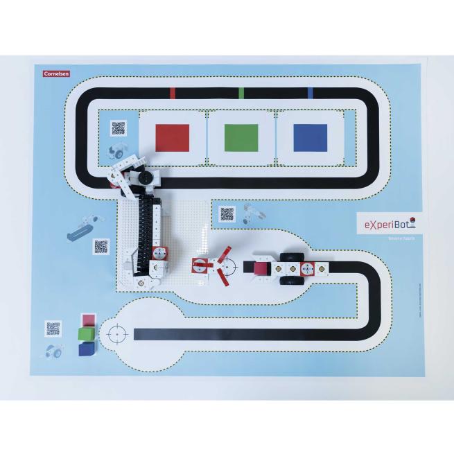 Insgesamt zählen 4 eXperiBots zum Set: 1 Schieber, 1 Greifer, 1 Fließband sowie 1 Sortierer. Alle Bots sind kompakt gestaltet und auf die wesentlichen Funktionen reduziert. Sie bestehen aus wenigen Einzelteilen, die Sie und Ihre SuS über simple und zugleich sehr stabile Druck- und Steck-Verbindungen in kürzester Zeit zusammensetzen. Eine Bauanleitung gehört zum Lieferumfang. Schieber und Sortierer haben Räder und sind mobil. Die Roboter bewegen sich und koordinieren ihre Aktionen anhand der auf den Spielplan aufgedruckten schwarzen Linien und bunten Farbfelder, die die Bots mithilfe ihres jeweiligen Multisensors erkennen.